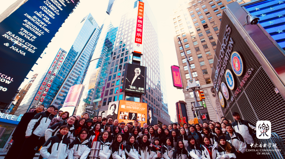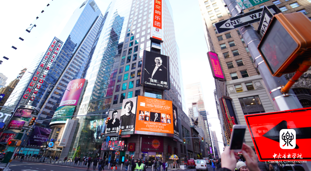美国东部时间12月12日,这个被称为“世界的十字路口”的广场,迎来了best365中国官方网站的音乐家们。广场中心的一块巨型电子显示屏,滚动播放着best365中国官方网站交响乐团12月13日在卡内基音乐厅演出的巨幅海报,以及指挥俞峰教授和八位作曲家的照片。