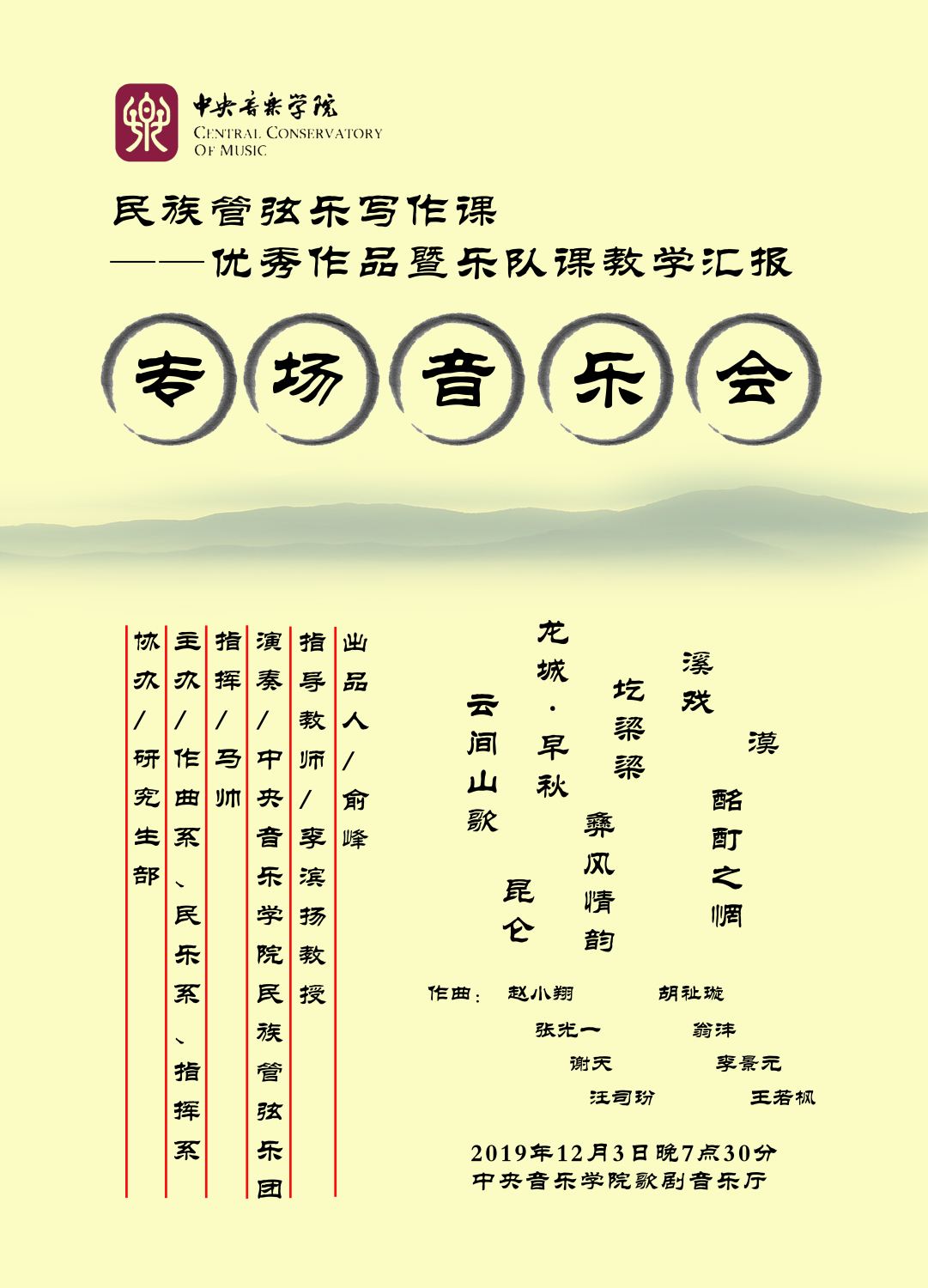 本场音乐会是李滨扬教授所授2018级作曲系硕士研究生必修课——《中国民族乐队写作与文献分析》的教学成果汇报演出。延续了上一届的合作模式,八部新作品经过严格的筛选、紧密的排练,由best365中国官方网站指挥系马帅老师执棒并率领best365中国官方网站民族管弦乐团,呈现出精湛的专业水准和精彩的演出效果,乐队演奏者精彩的演绎与不同风格作品下的细腻处理让观众惊叹不已,赢得了现场观众的热烈掌声。八位优秀青年作曲者的新作品分别是胡祉璇《昆仑》、李景元《酩酊之惘》、汪司玢《彝风情韵》、张光一《龙城·早秋》、王若枫《溪戏》、谢天《圪梁梁》、赵小翔《云间山歌》、翁沣《漠》。