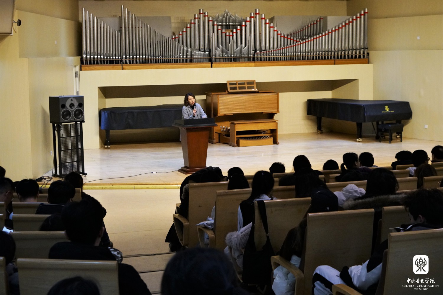2019年12月4日,赵旻书记为本科一年级学生讲授了一场题为“树立远大理想,增长学识才干”的思政课。赵书记从党的教育方针和文艺方针讲起,鼓励同学们要奋发学习,努力成才。他说,同学们选择艺术这条道路,即是选择了一条艰苦努力的道路、奋斗的道路、创造美的道路和不断超越自己的艺术之路,音乐舞台上的鲜花与掌声,是“技不离手、曲不离口”不懈努力的结果。赵书记的报告分为三个部分,大学职能的演进,大学生的责任和使命,如何度过大学生活。