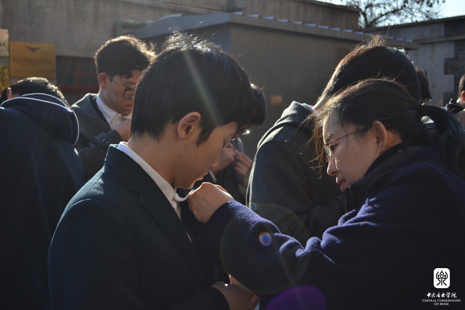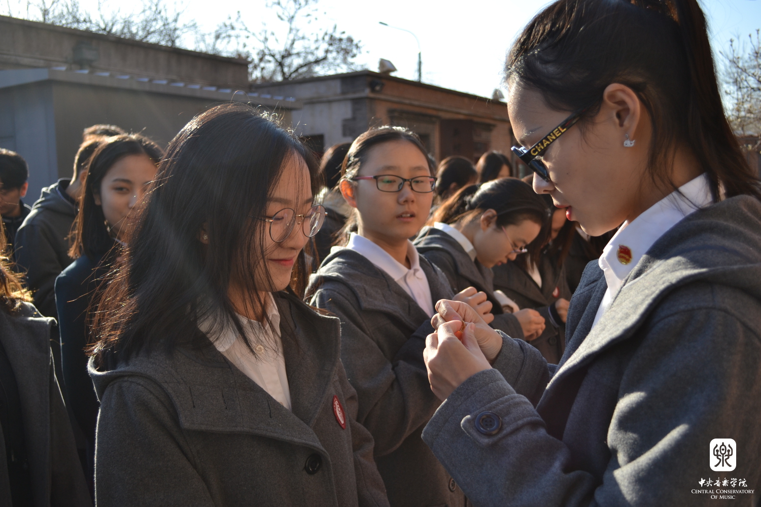 老团员为新团员佩戴团徽