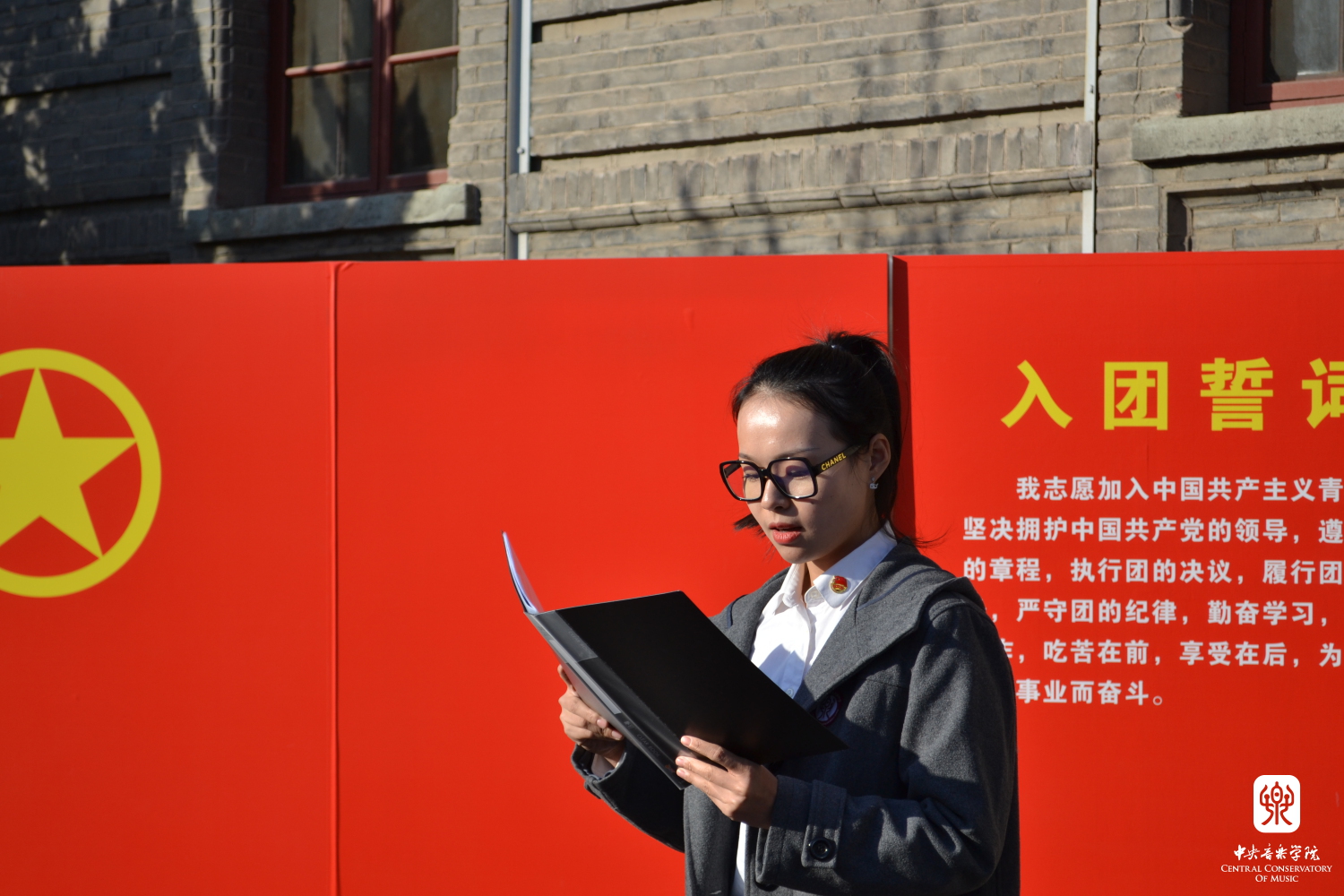 入团宣誓仪式由团总支组织部长陈玥主持。午后的阳光耀眼温暖,共青团歌悠扬唱着,团员们就像五月的花海,充满了朝气与自信;宣誓声铿锵有力,新团员们在团旗前许下永不改变的诺言,崭新的血液注入附中共青团;老团员为新团员佩戴团徽,传承的力量悄悄传递,相信新团员们在未来的生活中一定会以身作则,为团组织作贡献。