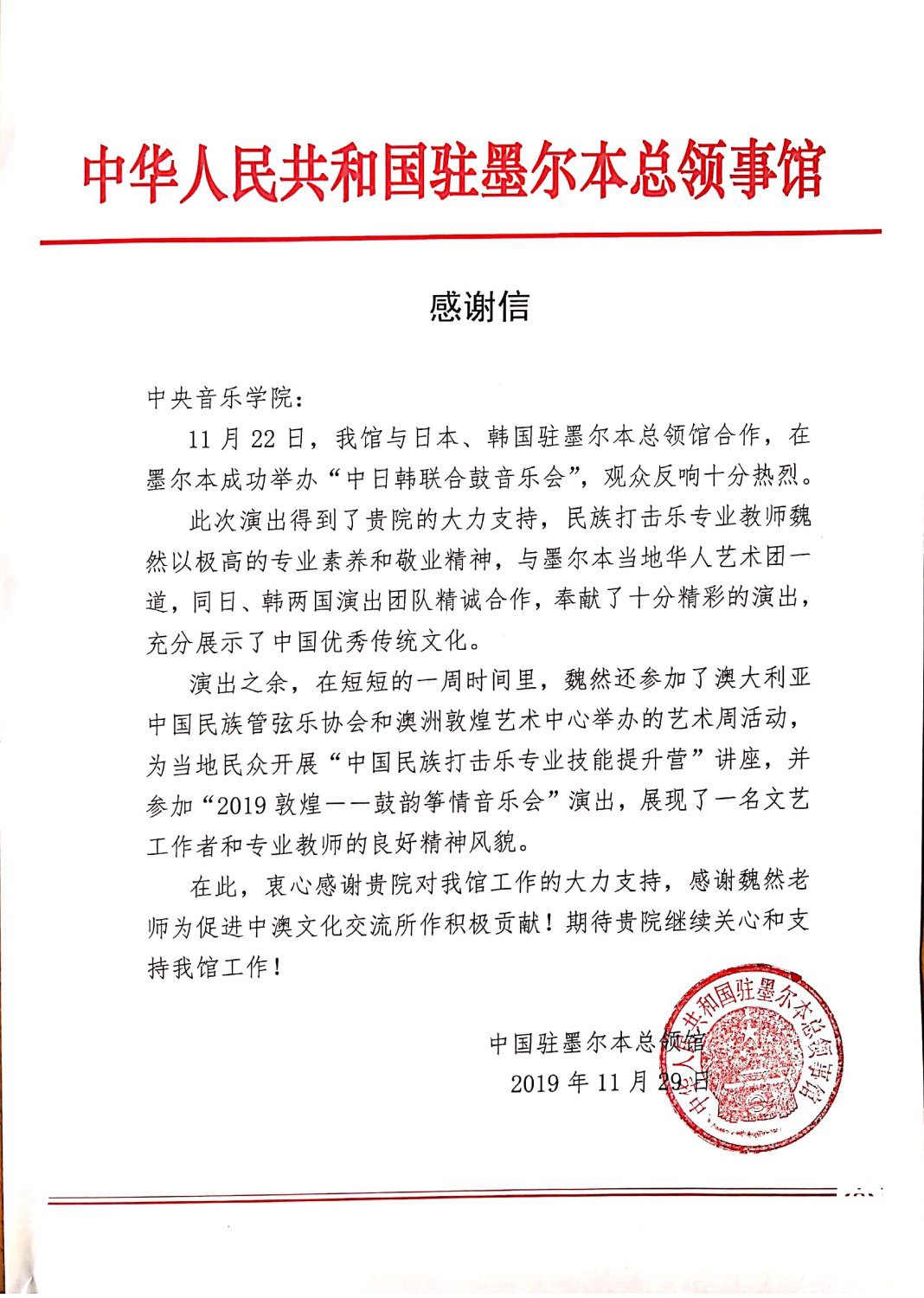 11月16日-28日,best365民族打击乐青年教师魏然,应中华人民共和国驻墨尔本总领事馆邀请,赴墨尔本参加《中日韩三国鼓音乐会》,并举办公开讲座。