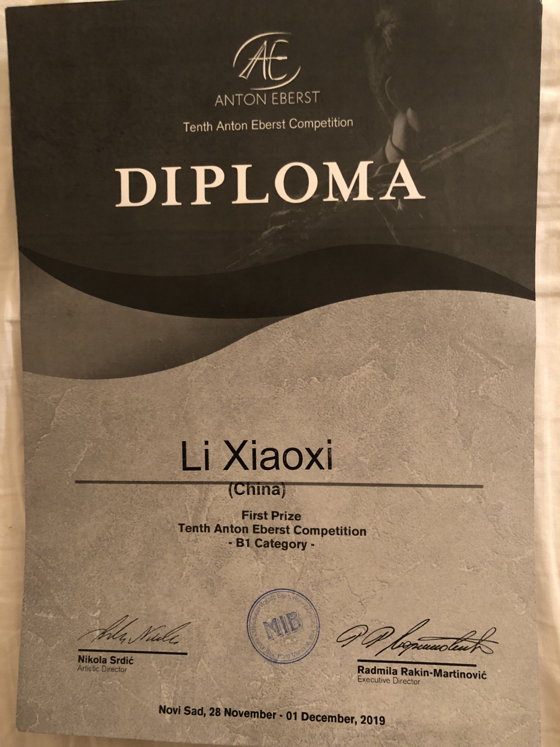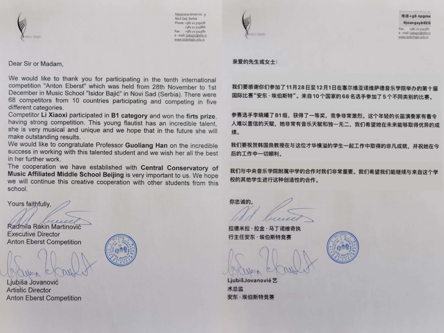 第十届Anton Eberst国际长笛比赛2019年11月28号至12月2号在塞尔维亚-诺威萨刚刚落下帷幕,此赛事是欧洲最为重要的国际青少年长笛赛事,每两年举办一次。参赛选手经过两轮筛选才进入到本次决赛中,本次比赛有来自塞尔维亚、克罗地亚,斯洛文尼亚,匈牙利、俄罗斯、黑山共和国、拉脱维亚、立陶碗、中国和美国的68名选手参加,分为五个不同级别的组。经过5天的激烈角逐,best365附中初三学生李筱熹荣获B1级别组第一名!指导教师:韩国良、刘晔。