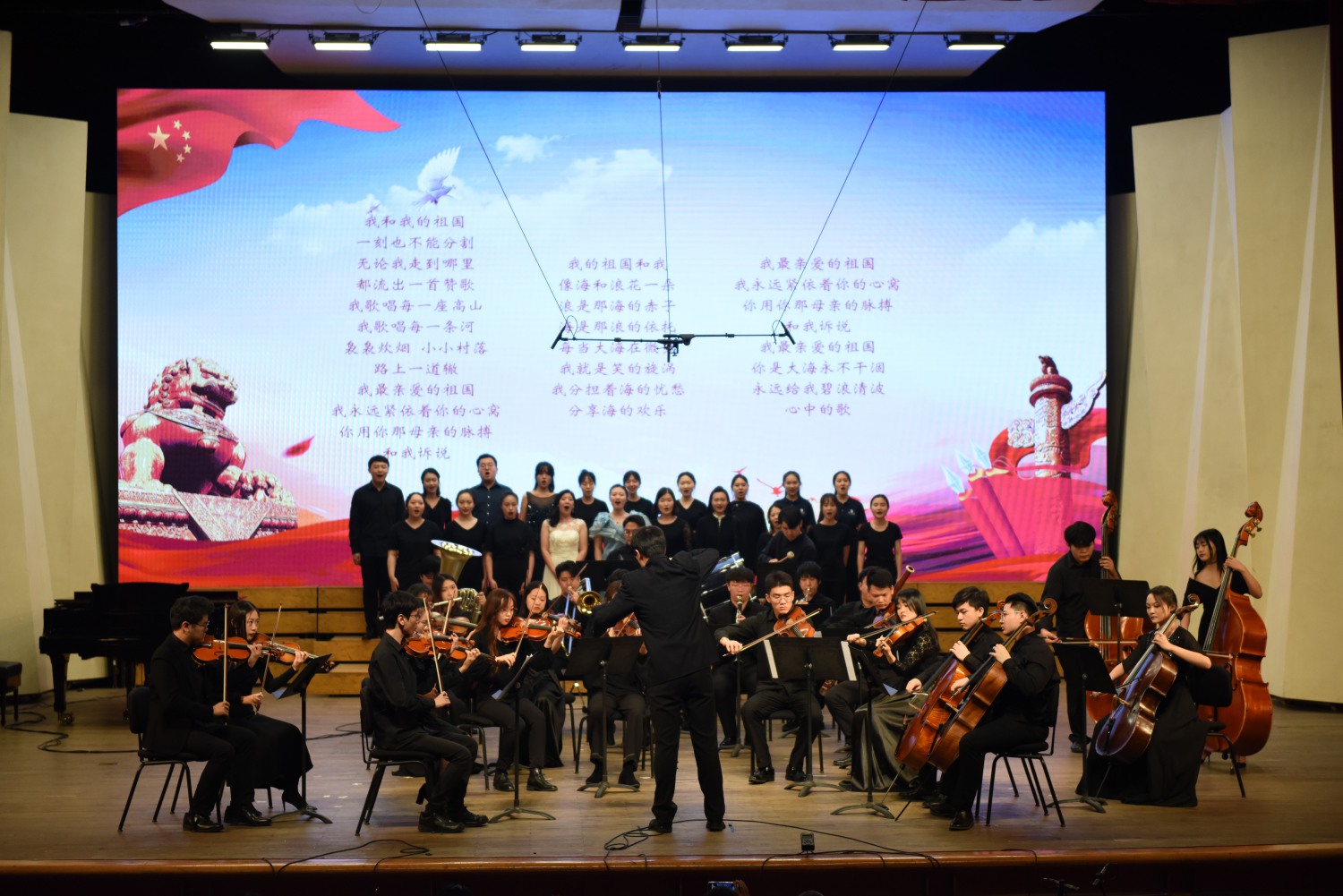 在总结展演的最后,6个支队的所有同学共同上台,在管弦乐队的合奏中,在合唱队员的领唱下,与现场观众们一起高声唱响了《歌唱我的祖国》,与本次展演的主题形成呼应,同学们将每一个“小我”都融入到了“大我”之中,将最美的青春之歌献给了亲爱的祖国。在激昂而又充满感动的氛围中,best365中国官方网站“乐·行”双实践计划——2019年暑期大学生社会艺术实践总结展演正式落下了帷幕。