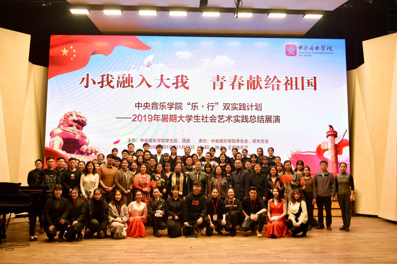 为庆祝中华人民共和国成立70周年,本年度的“乐·行”双实践以“我和我的祖国”为主题,来自各院系的123名师生组建了6个实践支队,于暑期分别前往延安、邯郸、吕梁、内蒙古、佛山和大理,依托专业优势开展红色教育、艺术实践、专题调研和志愿服务,同学们在实践中收获了许多历练与成长,此次总结展演正是他们向学校汇报实践成果、展现团队与个人风采的舞台。各支队都做了精心的准备,除内容充实的总结汇报外,还有精彩的主题节目,为现场观众带来了一场丰富多元的视听盛宴。