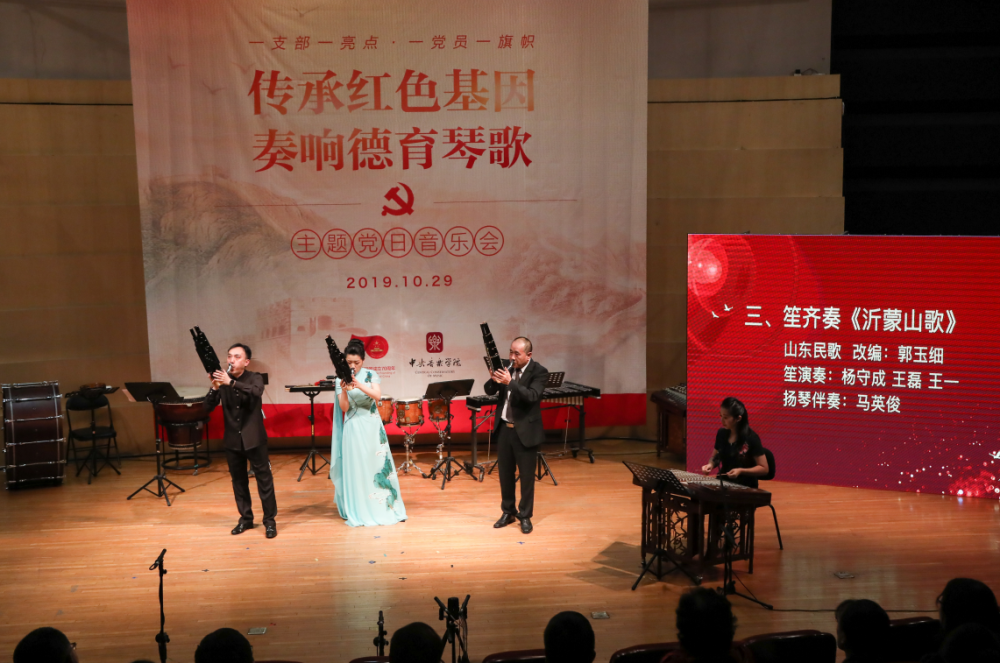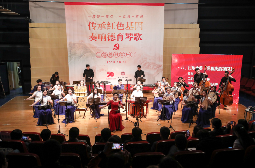 在开场的讲话中,民乐系党总支书记石海彬教授提到,民乐系党总支用音乐、艺术拓展主题党日形式,用音乐诠释对初心、使命的理解。民乐系教师支部书记杨雪副教授向观众介绍,讲演结合的形式是此次音乐会的一大亮点。通过讲解、分享,老师们将用具有家国情怀、爱国主义的经典民乐作品表达对初心的感悟。此次音乐会,是民乐系党总支以极高的凝聚力,通过师生党员同台合作的形式奏响德育琴歌,同时也向祖国母亲70周年华诞献礼。