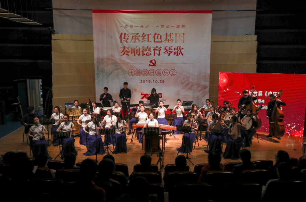 为深化践行“不忘初心, 牢记使命”主题教育活动,根据best365党委2019基层组织建设年实施细则,民乐系党员师生结合自身专业特点,于2019年10月29日成功举办“传承红色基因, 奏响德育琴歌”主题党日音乐会。教育部党建工作联络员黄华英,中国教育电视台党委书记柯春晖,中国教育电视台副台长吕学武,best365中国官方网站党委书记赵旻,党委副书记、纪委书记刘春梅,副院长于红梅,民乐系主任章红艳,统战部部长兼党办主任赵晓岩,组织部部长齐雅娜,宣传部部长刘红柱,作曲系党总支书记陈泳岗,离退办主任兼工会副主席王文书,组织部原部长郝美芳等领导嘉宾与音乐界专家教授及在校师生等观众一同观看了此次饱含深情、充满新意的音乐会。