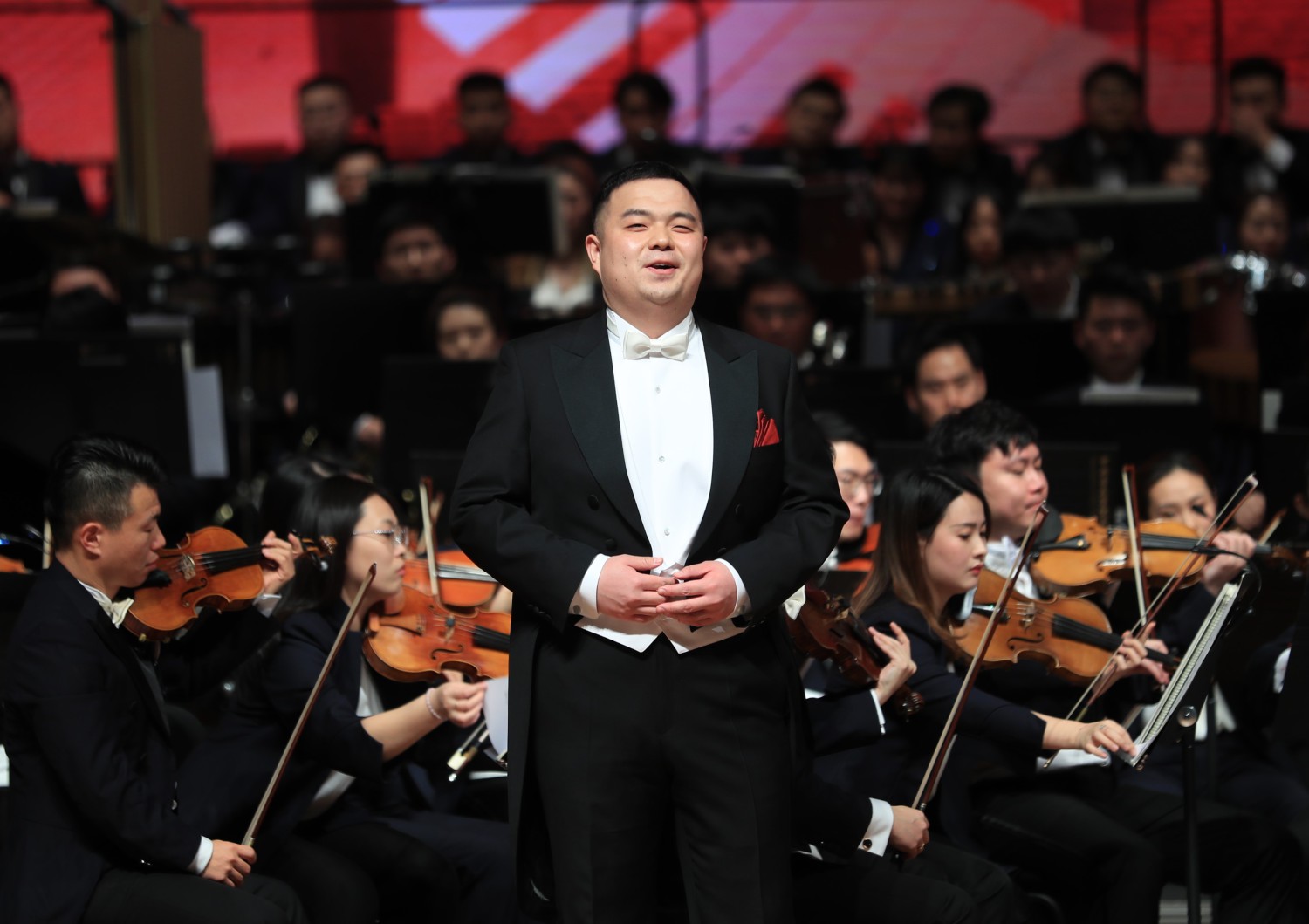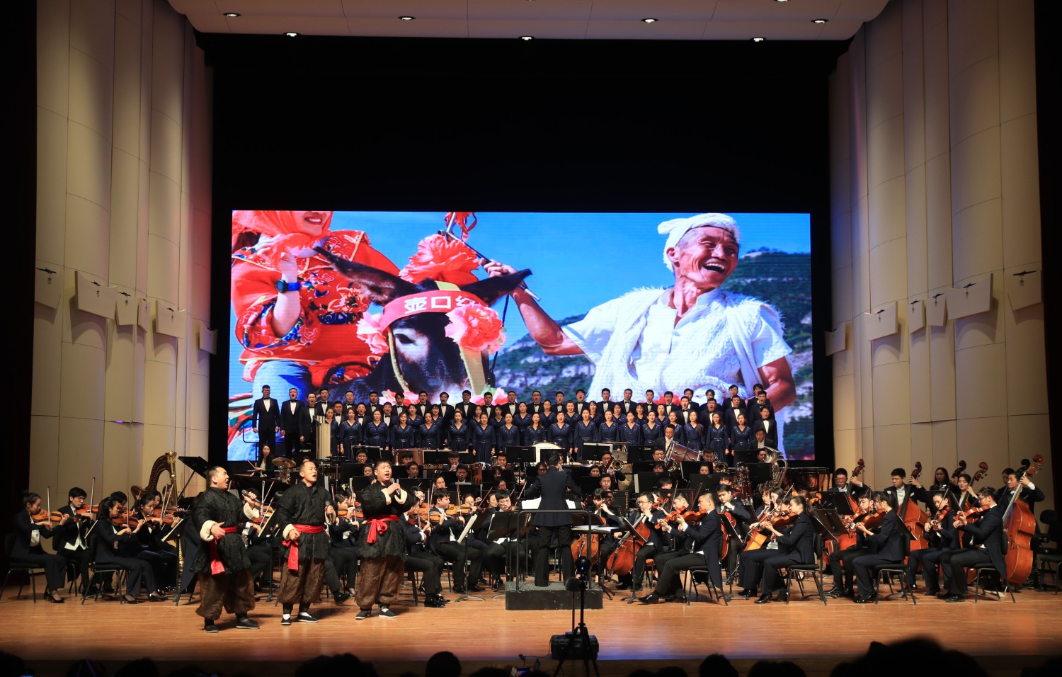 新年音乐会特别邀请了延安志丹县的“红都组合”来到现场,演唱best365作曲系张帅副教授创作的《大河之水》,掀起音乐会的高潮。《大河之水》作为今年第二届best365中国官方网站延安·10.15艺术节“新时代·新民歌”专场音乐会的一首优秀作品,获得广泛好评。威风凛凛、气宇轩昂的音乐,催人泪下的旋律,三位土生土长的陕北民间歌手与交响乐队、合唱团合作碰撞出激烈火花,如大河之水气势恢宏。曲作者张帅教授上台介绍了新时代·新民歌音乐会的筹备与演出过程以及自身创作时的感受。10.15艺术节,best365中国官方网站的作曲家们从当地征集的百余首歌词中选取17首创作了新民歌,为延安人民献上了一场具有浓浓陕北风情的融合中西雅俗、传统现代的民歌作品专场音乐会,用歌声抒发对党和国家的热爱、对美好生活的向往,《大河之水》作为音乐会最后一首作品,用高昂嘹亮的歌声展现出了陕北汉子们的豪情壮志。