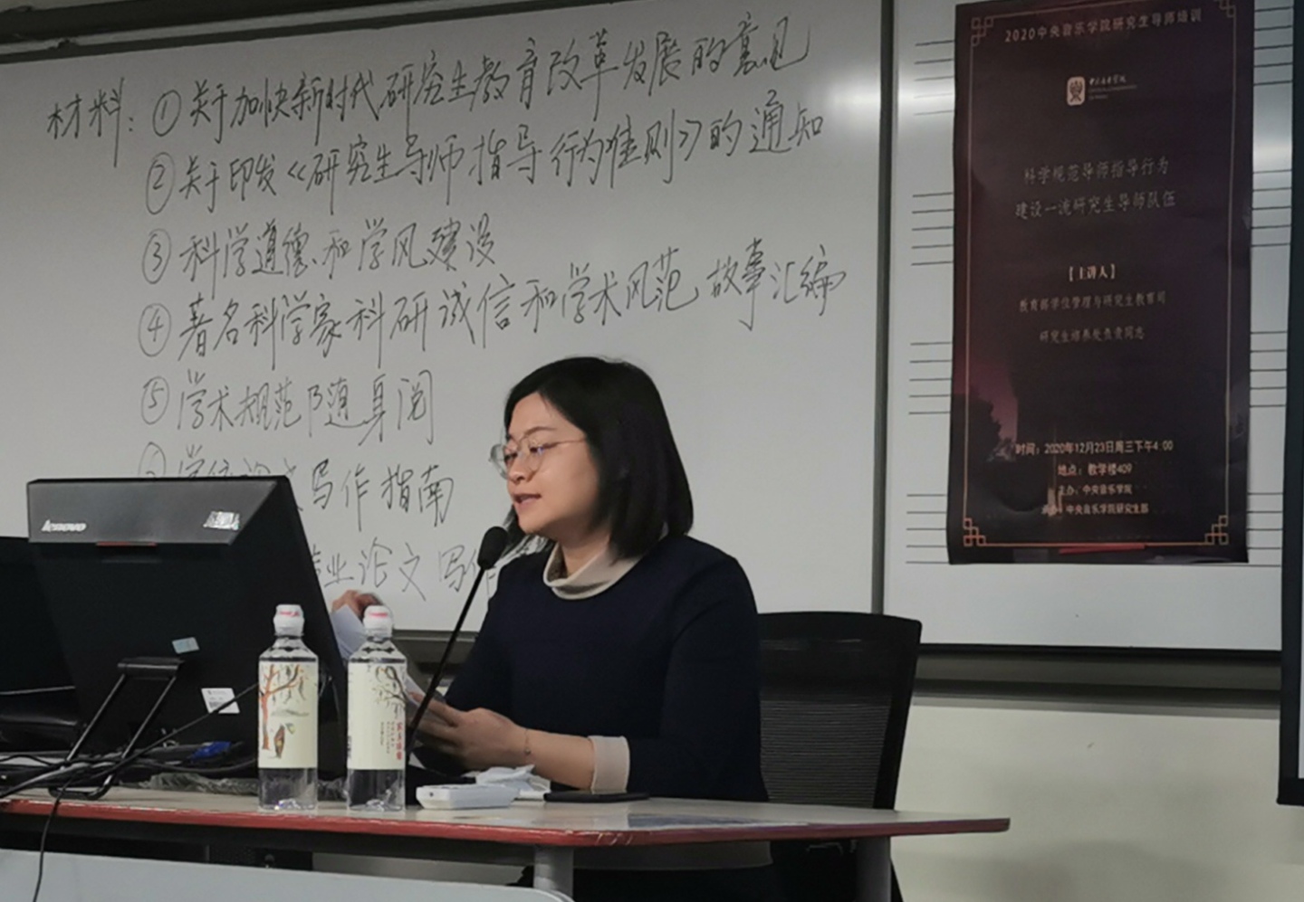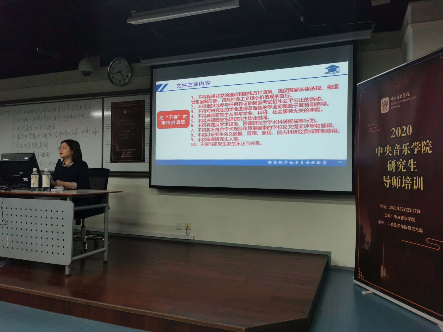 培训工作以讲座、各系部集中学习和个人学习相结合的形式开展。学校邀请了教育部学位管理与研究生教育司研究生培养处副处长刘帅同志,于12月23日下午四点在教学楼409教室,作了题为 “科学规范导师指导行为 建设一流研究生导师队伍”的讲座,刘帅同志围绕教育部近期印发的《研究生导师指导行为准则》,从文件出台意义、文件核心内容和下一步落实举措三个方面进行了讲解,重点对导师行为规范的“十不得”进行了解读。