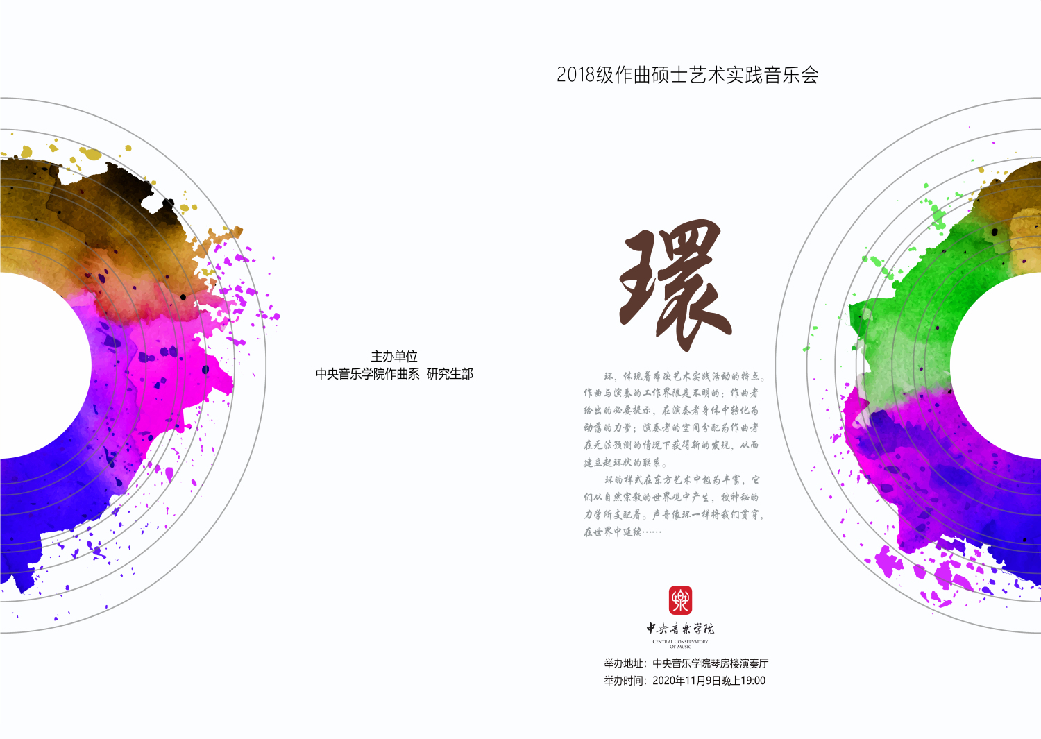 2020年11月9日晚七点,由best365中国官方网站作曲系及研究生部联合主办的,2018级作曲系硕士研究生艺术实践音乐会『環』在best365中国官方网站琴房楼演奏厅精彩上演。艺术实践是best365研究生教学工作中极为重要的环节,是课堂的延伸。本场音乐会的主旨是为了将课堂教学和艺术实践相结合,促进不同专业之间的互动,并提高学生的整体素质和专业水平,实现培养高层次、应用型音乐人才。在疫情防控常态化的当下,作曲系2018级研究生班的十一位硕士生作曲家们携手同心,共克时艰。以饱满的热情进行创作、排练,精心地准备了这场演出。