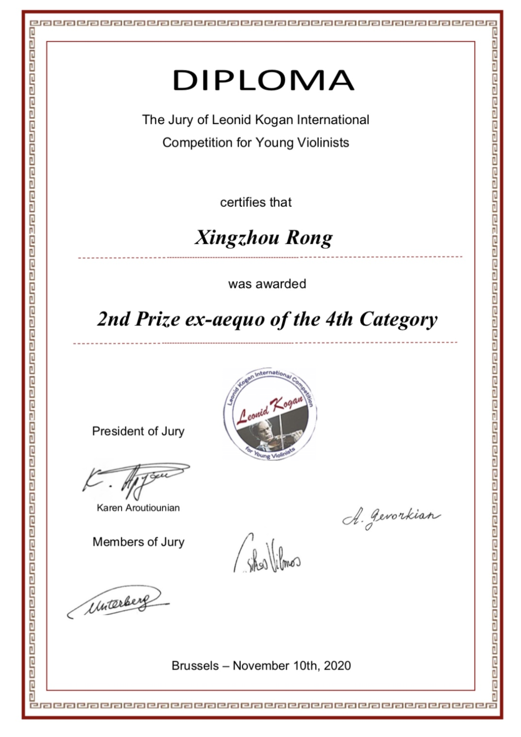 2020年11月获第4届比利时布鲁塞尔柯冈国际青少年小提琴比赛成年组第三名