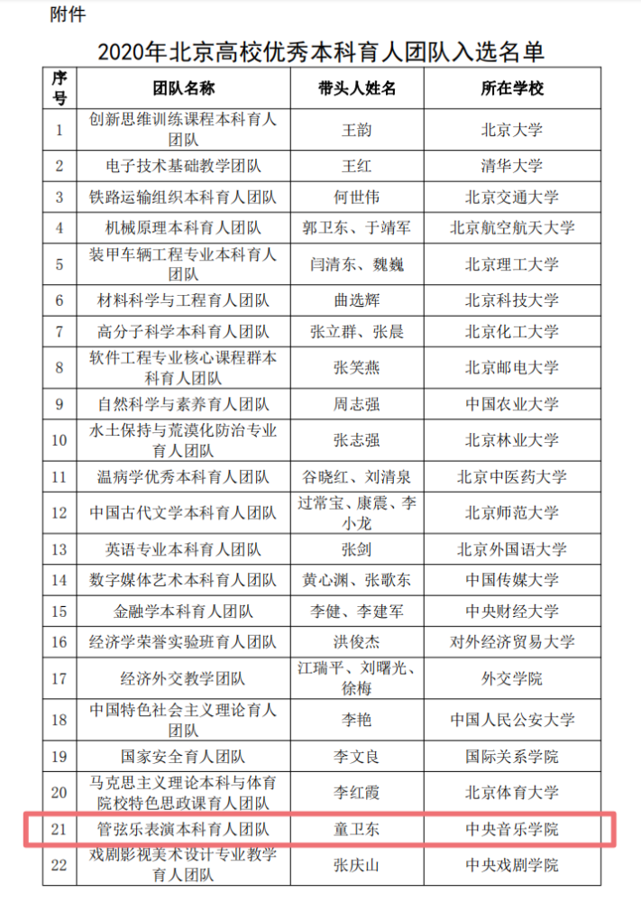 2020年5月,根据《北京市教育委员会关于开展2020年“北京高校优秀本科育人团队”和“北京高校优秀本科教学管理人员”评选工作的通知》(京教函〔2020〕149号)要求,管弦系在科研处的指导下,精心组织开展了申报工作。管弦乐表演本科育人团队作为best365音乐表演的核心教学团队之一,承担着全校管弦乐独奏、室内乐、乐队等课程教学任务。经过几代人的努力,该团队在课程建设、教书育人、教学方法与手段应用、教材编写等方面均取得了优异成绩,在国内外乐坛上产生了重大影响。经北京市教育委员会评审后,管弦乐表演本科育人团队最终脱颖而出,成为全市41个优秀育人团队之一。