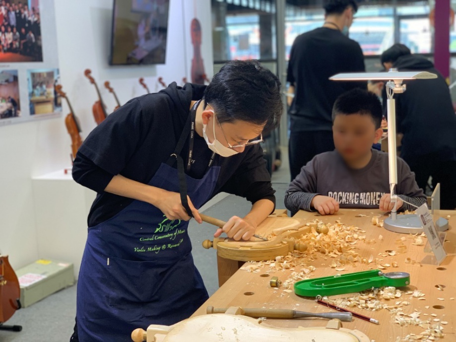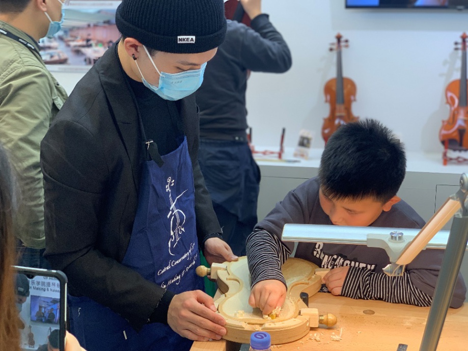 研一学生夏镇山正在协助小观众体验提琴面板制作