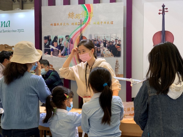 研一学生丁奕瑄正在协助顾客感受提琴制作操作过程