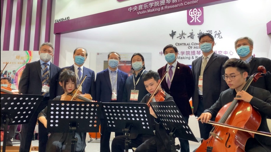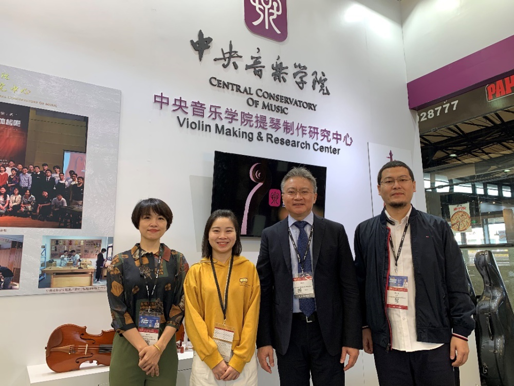 央音鼓浪屿钢琴学校教务科负责人、综合学科主科教师来访提琴制作展位与高彤彤教授合影,左起第二位为鼓浪屿钢琴学校提琴制作专业教师、央音提琴制作研究中心2020届硕士毕业生帅玉玲