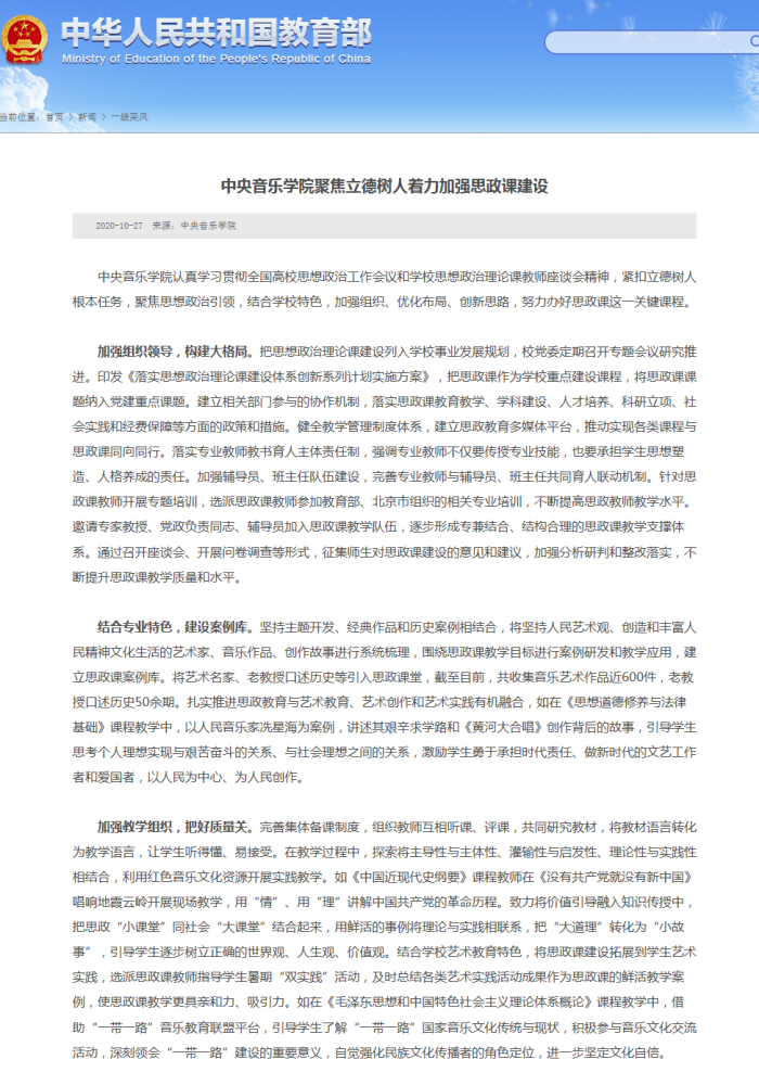 2020年10月27日,教育部政府门户网站发表《best365中国官方网站聚焦立德树人着力加强思政课建设》一文,对best365聚焦思想政治引领,结合学校特色,加强组织、优化布局、创新思路,努力办好思政课的情况进行报道。