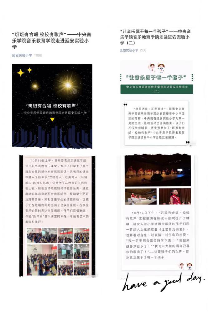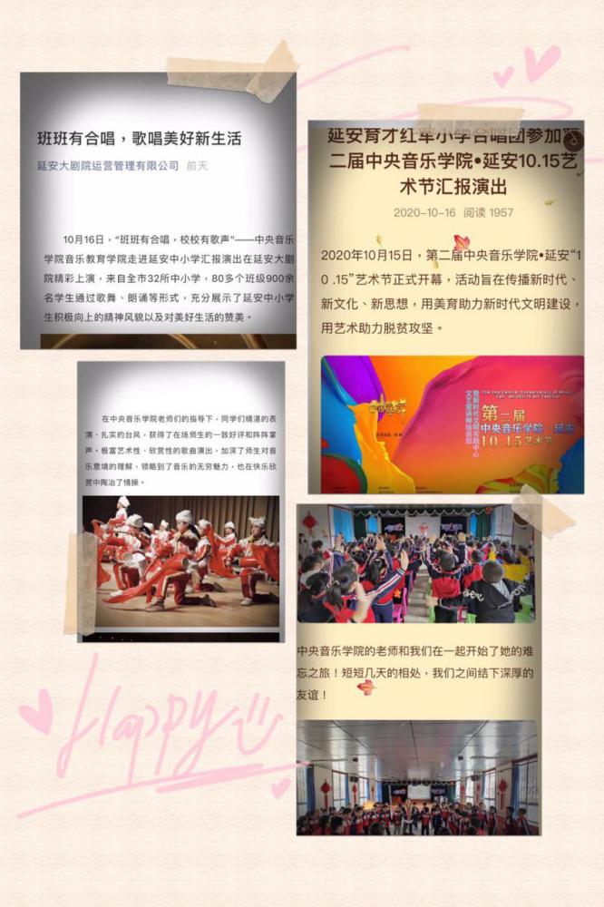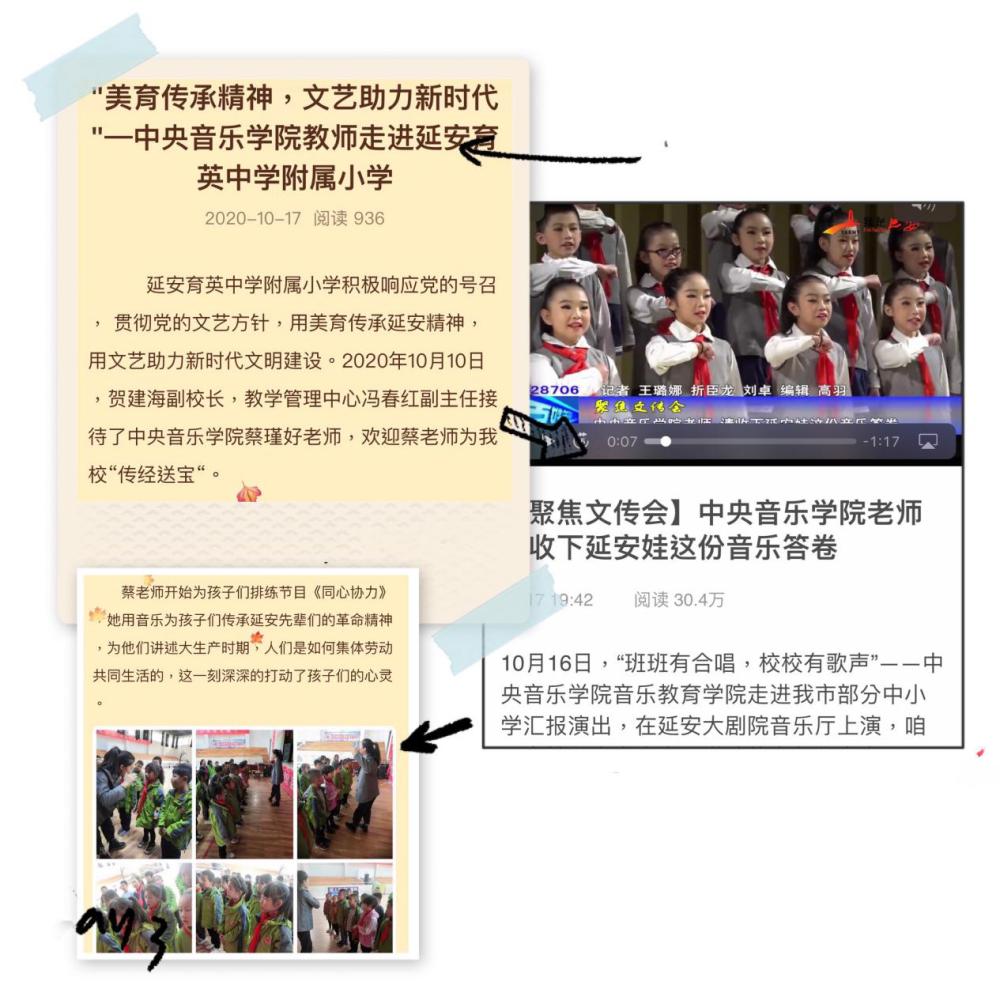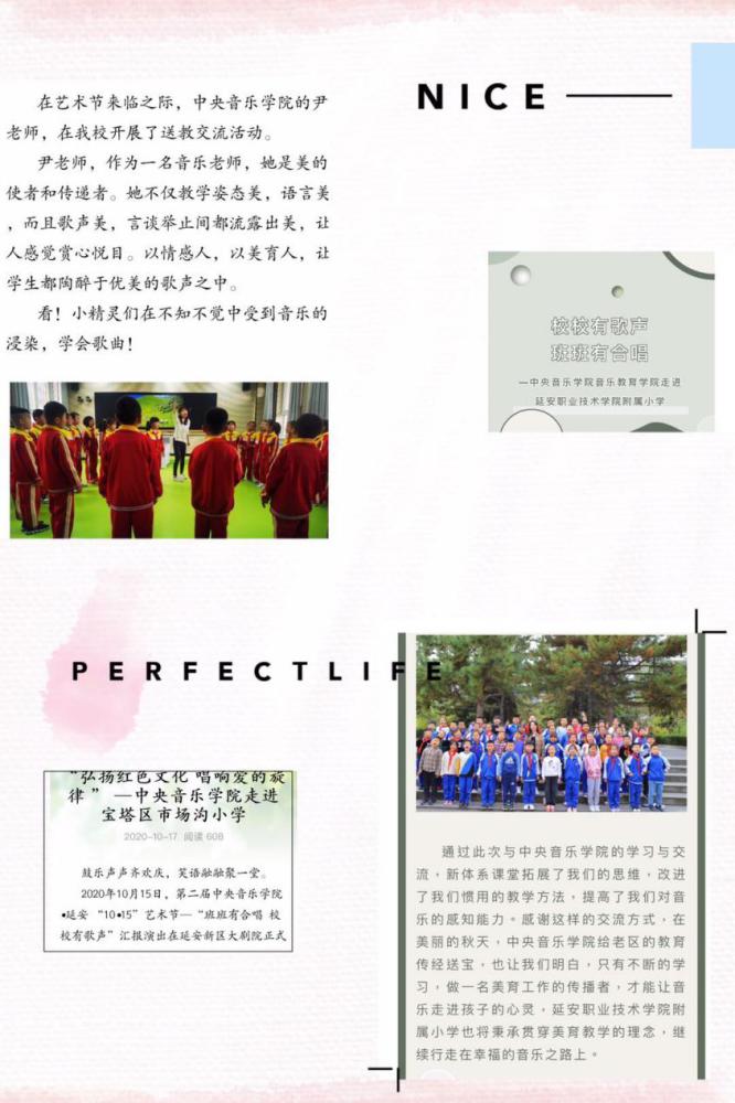 此外,还为中小学的合唱团挑选了《南泥湾》《少年少年祖国的春天》《歌声与微笑》《国家》《让世界充满爱》《明天会更好》等10多首优秀合唱作品作为教学内容。整个音乐教学活动以体验式歌唱教学法为指导,用音乐的真善美体验,激发并感化老区孩子对他们祖辈的敬仰和对祖国及家乡的热爱,激励“延安娃”们继承发扬延安精神,建设美好家园。