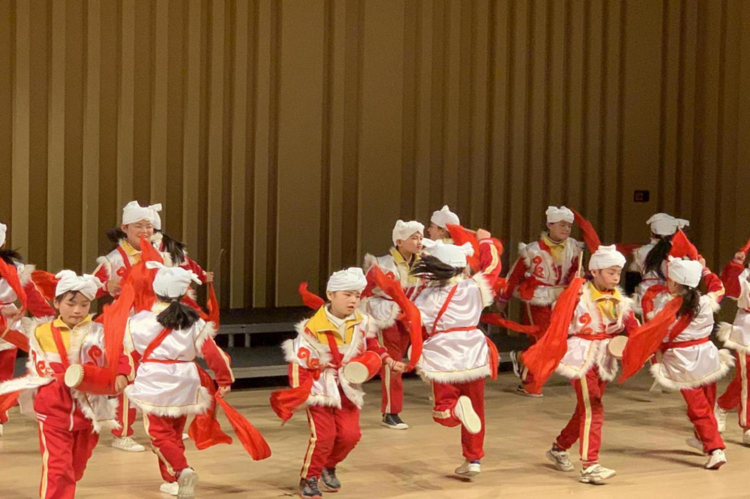 音乐会的开场是由来自延安新区清华附小、延安市宝塔区市场沟小学、延安市宝塔区中石油小学的三个班级,共122名一、二年级的学生们表演的《兴中华》,在琴声中,孩子们通过有表情的诵读,把56个民族团结奋发,海峡两岸是一家,祖国山川美如画的情景告诉大家。