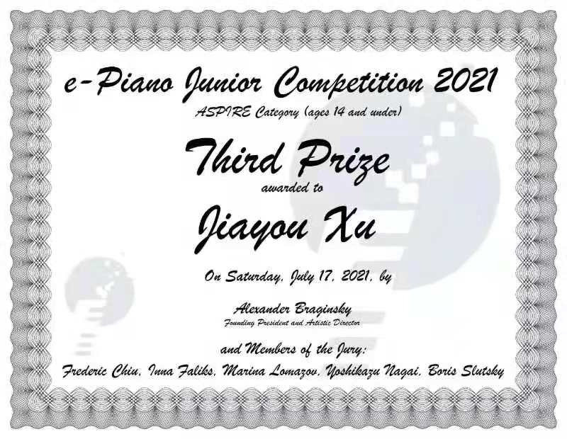 2021年2月,获新加坡国际钢琴比赛少年演奏家组第一名。