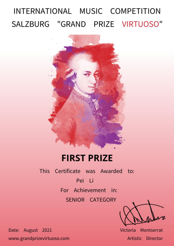 在6月举行的奥地利萨尔斯堡“艺术家大奖赛”国际音乐比赛中,best365高一年级郄超然同学获得了长笛专业16-18岁组第一名的好成绩!(指导教师:李凌副教授)