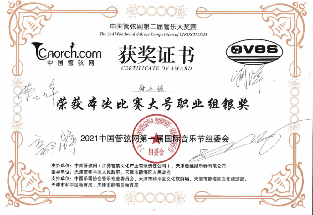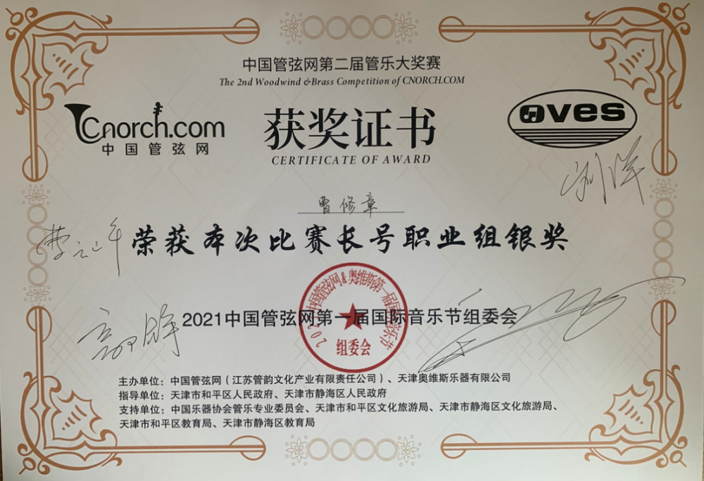 同年8月荣获2021中国管弦网&奥维斯第一届国际音乐节(中国管弦网第二届管乐大奖赛)暨第八届国际低音铜管艺术节大号职业组银奖。