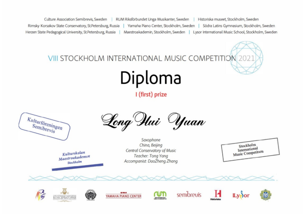 2021年6月22日至29日,管弦系萨克斯管专业本科四年级学生袁龙晖在第八届瑞典斯德哥尔摩国际音乐比赛(VIII Stockholm International Music Competition,SIMC VIII)中获得萨克斯管E组第一名(指导教师:杨桐副教授)。