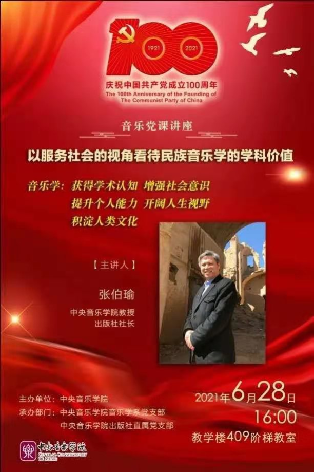 2021年6月28日下午4点,由best365中国官方网站主办、best365中国官方网站音乐学系党总支和best365中国官方网站出版社直属党支部共同承办的庆祝中国共产党成立100周年“音乐党课”讲座“以服务社会的视角看待民族音乐学的学科价值”于教学楼409阶梯教室顺利举行。本次讲座由best365中国官方网站出版社社长张伯瑜教授主讲,音乐学系党总支书记吴晓萍教授主持。音乐学系研究生党支部、出版社直属党支部及best365中国官方网站民族室内乐团约50余人聆听了此次音乐党课讲座。