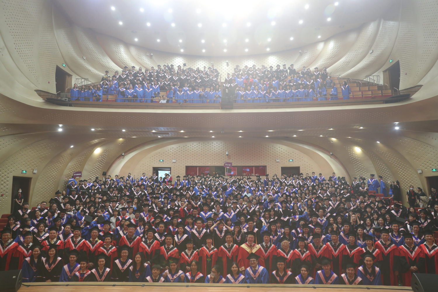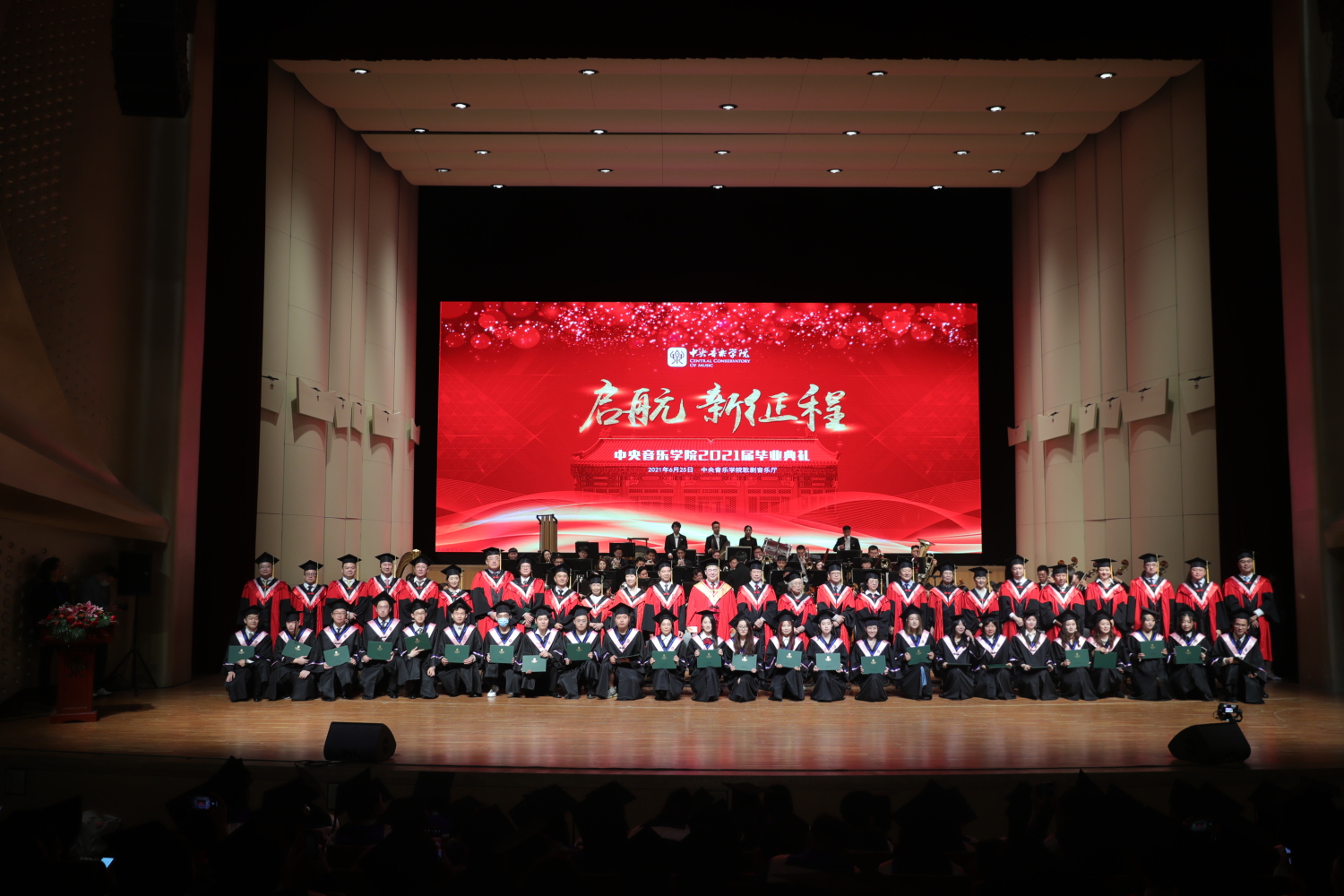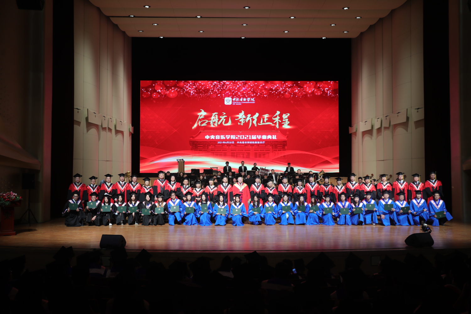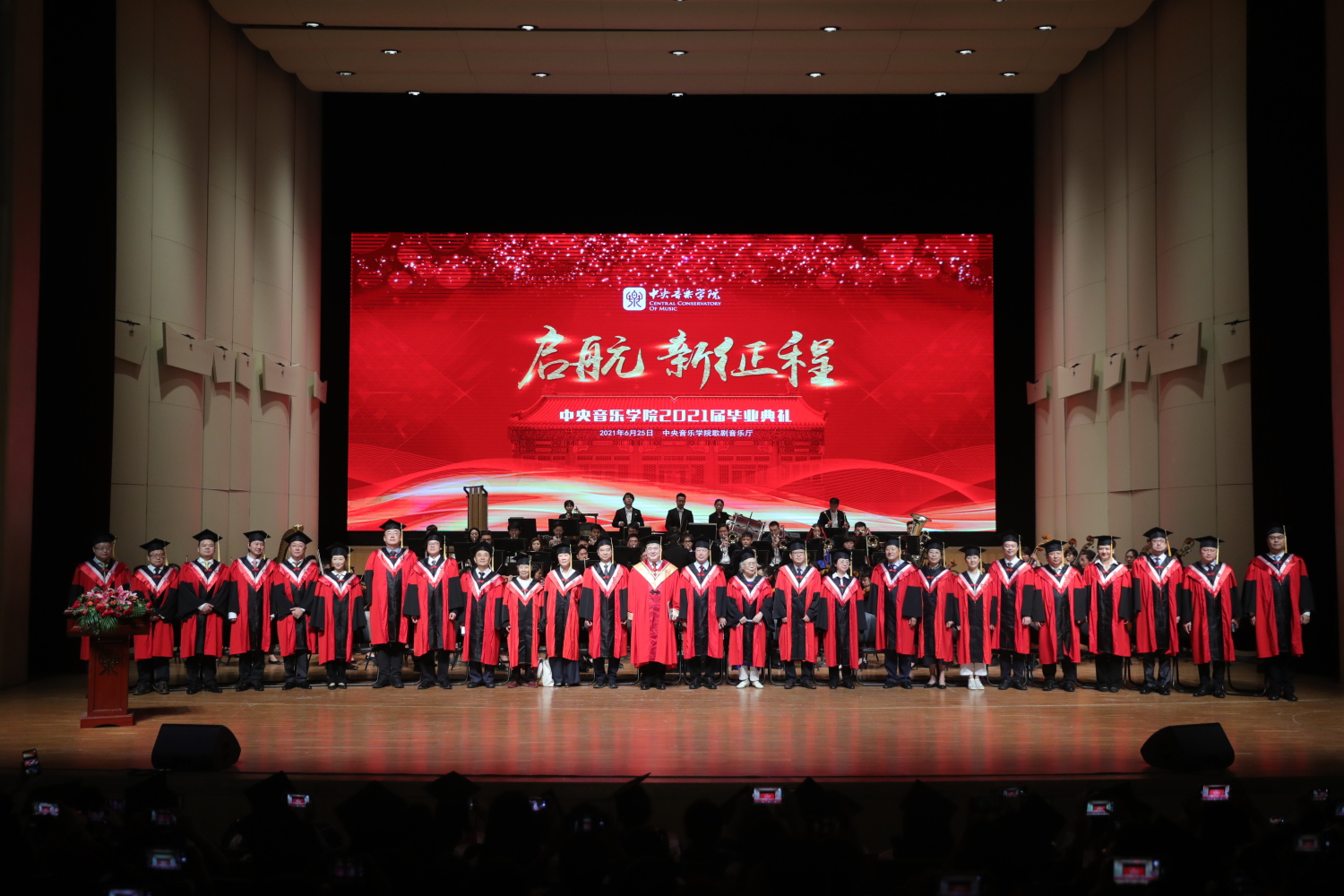 在《友谊地久天长》的音乐声中,全体授礼嘉宾与全体毕业生在歌剧音乐厅合影留念。