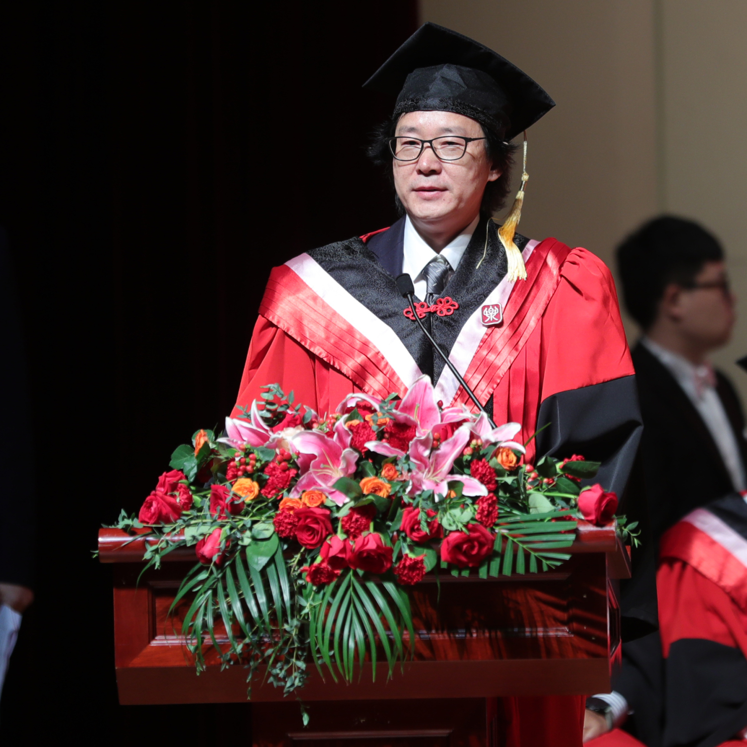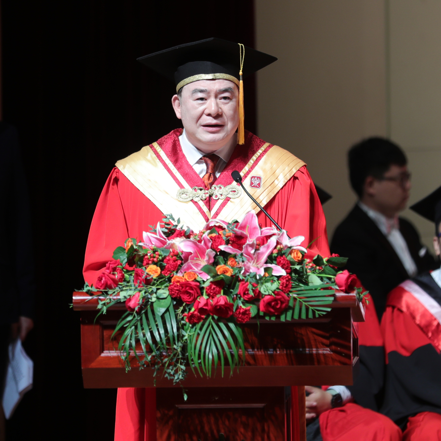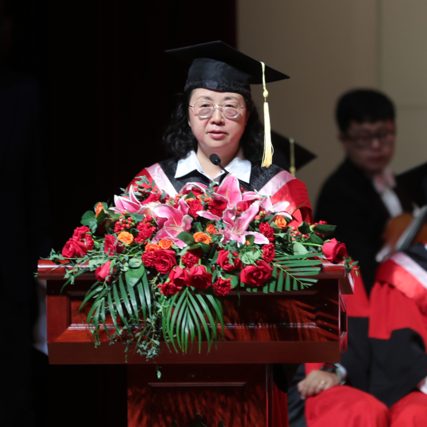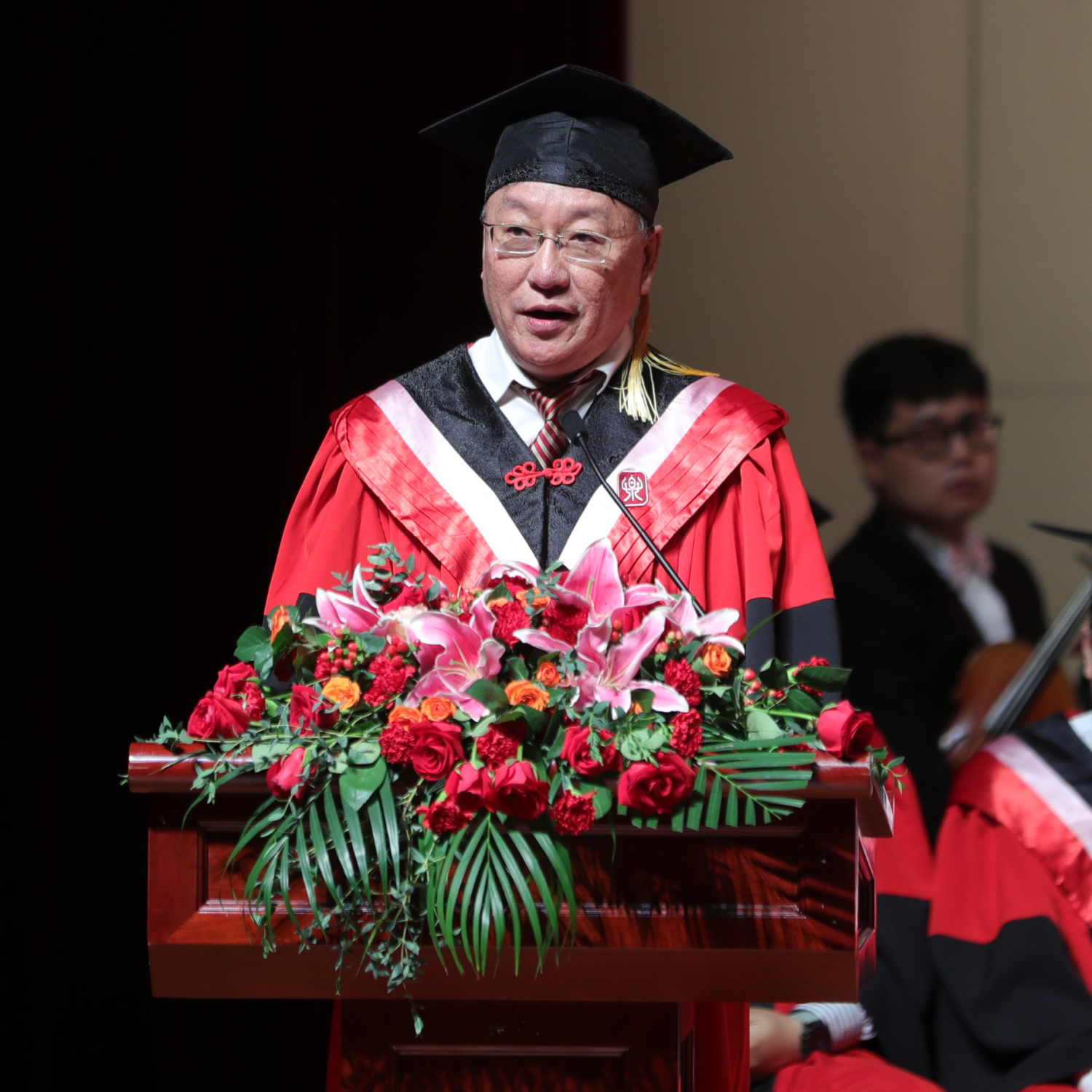 党委书记赵旻、院长俞峰、副院长肖学俊、党委副书记苗建华、副院长秦文琛、副院长于红梅、党委副书记、纪委书记刘春梅、副院长柯扬,特邀嘉宾王次炤、郭淑珍、高建进、陶纯孝、郭文景教授,作曲系郝维亚、指挥系陈琳和陈冰、音乐学系安平、音乐教育学院张征、钢琴系韦丹文、管弦系童卫东、民乐系章红艳、声乐歌剧系谢天、提琴制作中心高彤彤、音乐人工智能与信息科技系李小兵、音研所贾国平、乐队学院陈光、现代远程音乐教育学院方恒健等系(院)主任(院长)作为授礼嘉宾参加典礼。毕业典礼由学生工作部副部长刘兴辰主持。