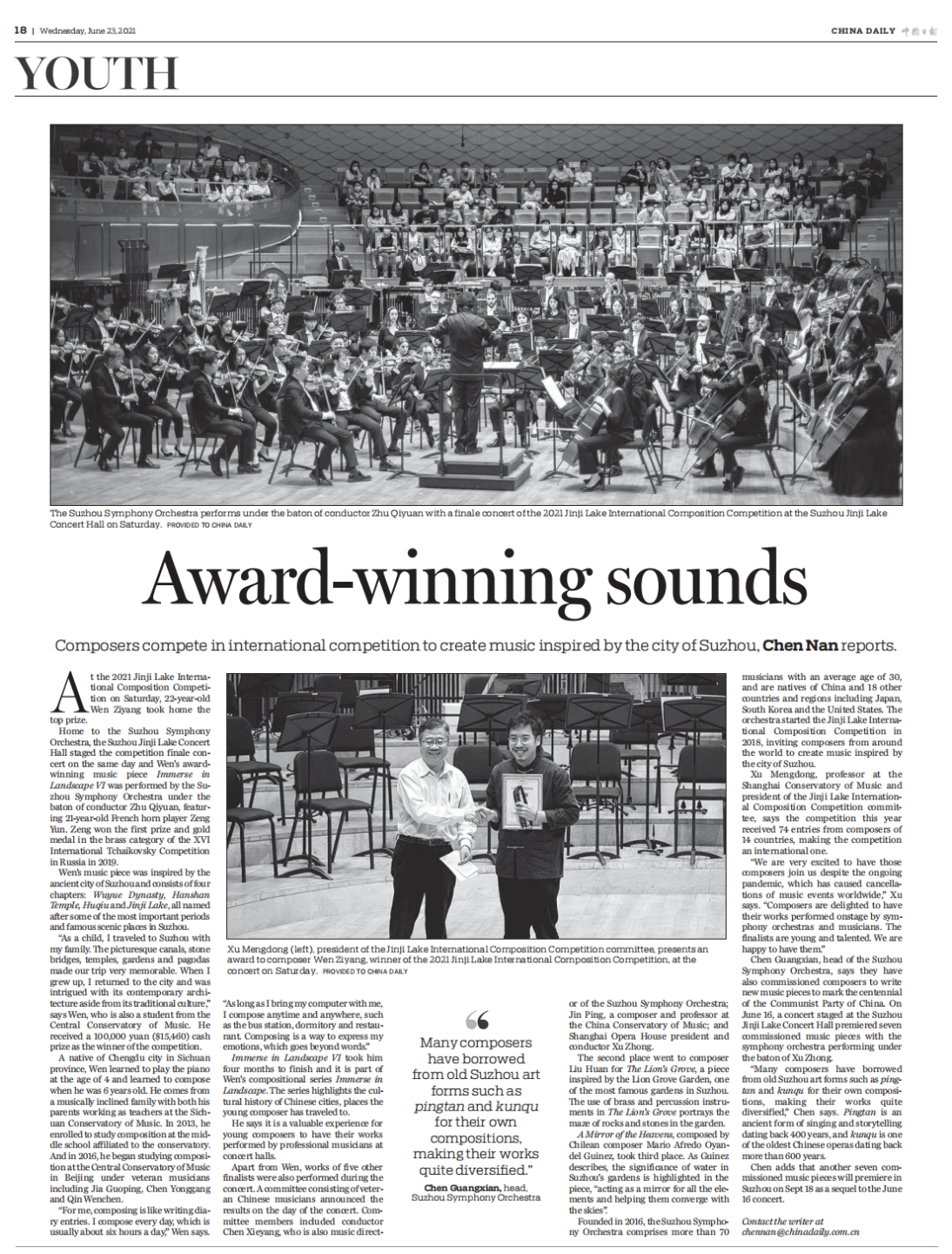 2021年6月,2021第二届苏州金鸡湖作曲比赛决赛在苏州落下帷幕。本届比赛以建党百年以及江南文化为创作主题,要求参赛选手运用现代的作曲创作技法,展现新颖的创作思路及丰富的音乐语汇,体现时代精神及苏州地方文化特色,在建党100周年之际,以姑苏风韵共同谱写时代强音。比赛面向全球征集作品,最终征集到14个国家与地区的74份作品,经过评委会匿名评审从中选出6首进入决赛。