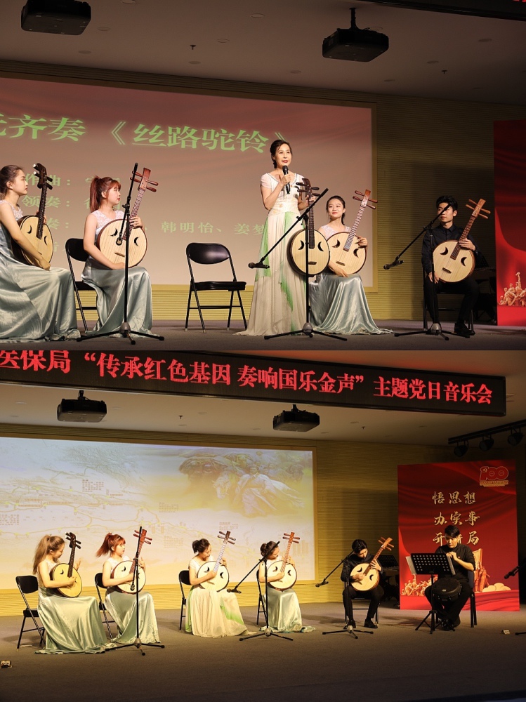 活动由民乐系党总支教师党支部书记杨雪副教授和医保中心党总支辛筱茗主持。音乐会以教师党员尹飞带领进击打击乐团演奏的中国打击乐合奏《龙腾虎跃》拉开了序幕,随后演奏了板胡、二胡齐奏《红军哥哥回来了》(板胡/胡瑜、二胡/杨雪、孙凰、扬琴/马英俊),笙齐奏《微山湖船歌》(笙/王磊、王一、扬琴/马英俊),中阮齐奏《丝路驼铃》(阮领奏/徐阳、阮助奏/马丽鸿、韩明怡、姜梦、陈隆、打击乐/尹飞),琵琶重奏《唱支山歌给党听》(琵琶领奏/李晖、刘小菁、琵琶助奏/李佳炫、林佳翌、李俊麟、国金锜),广东音乐《平湖秋月》《步步高》(高胡/田再励、琵琶/刘小菁、扬琴/马英俊、中胡/杨雪、笛箫/蔡修湛、大阮/陈隆),唢呐齐奏《湘江情》(唢呐领奏/石海彬、唢呐助奏/郭一瑾、郭一瑶、笙/王磊、扬琴/马英俊),一首首经典作品不断将音乐会推向高潮。民乐系副系主任胡瑜副教授、党总支副书记王磊副教授、阮演奏家徐阳教授、琵琶演奏家李晖教授、胡琴演奏家田再励教授、民乐系党总支书记石海彬教授等教师党员依次发言,纷纷以各自专业为立足点,结合时代背景、中国精神,带领全场党员干部回到激情燃烧的岁月,激励大家不忘初心,牢记使命,向中国共产党成立100周年献礼。
