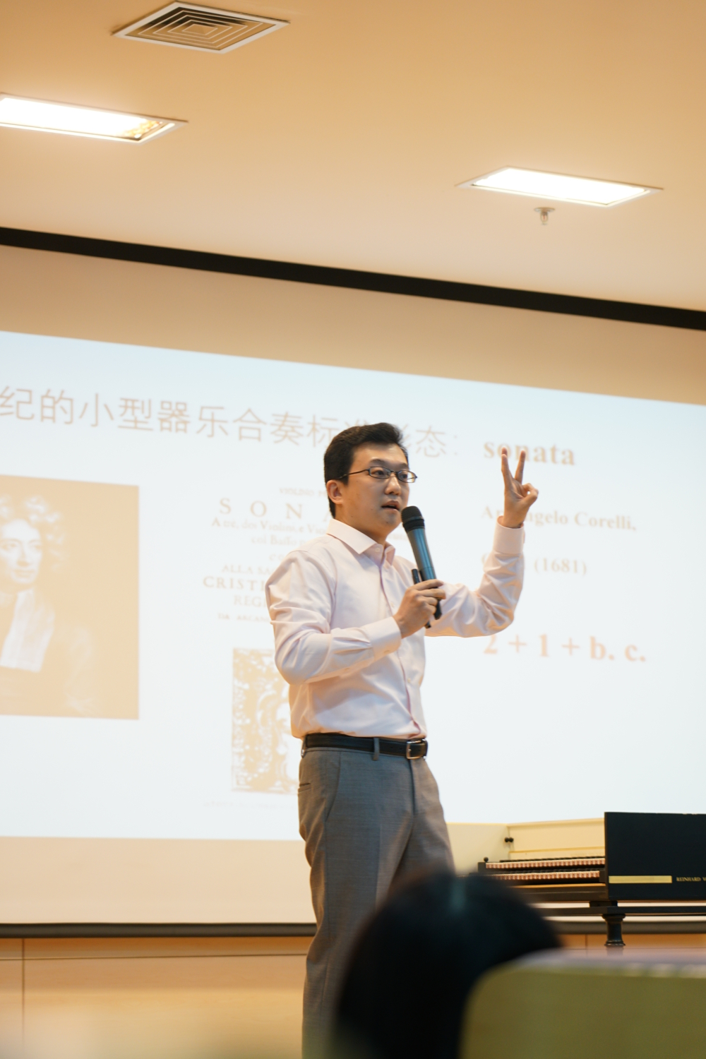 音乐会的第一部分,贾抒冰老师着重介绍了巴洛克时期的三重奏,以“时代的宝藏”科雷利和亨德尔两位作曲家为例,着重分析讲述了17世纪的小型器乐合奏标准形态—奏鸣曲(sonata)属于这个时代的特点:“故意为之的天才构想”——2+1+b.c。