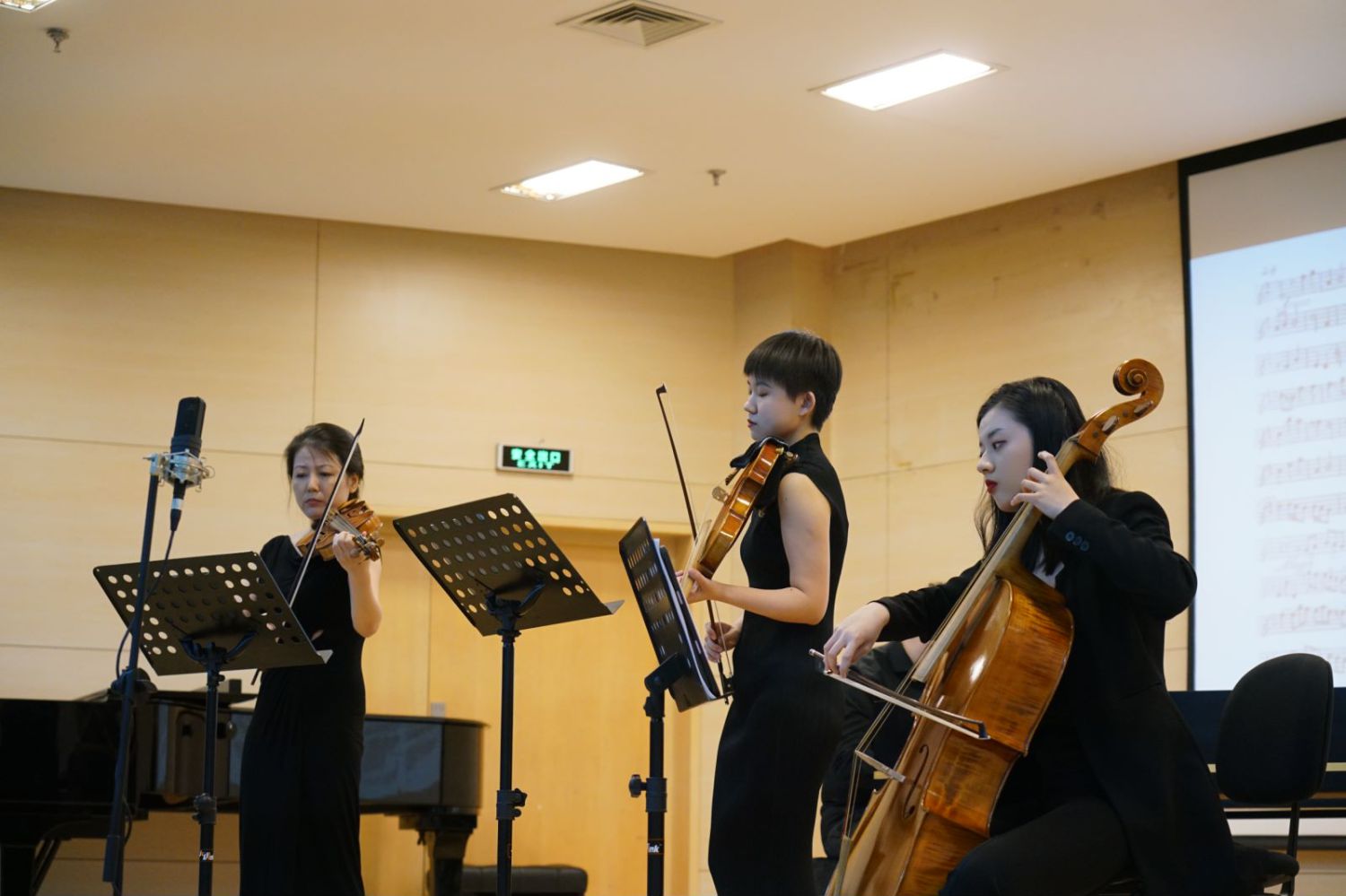 本场音乐会的第二部分,就到了“三重奏”完全由三件乐器组成、大家更为了解的古典时期。这一部分,贾抒冰老师以“钢琴”这一乐器的演变进化为线索,选择了三位大家都非常熟悉的音乐家——海顿、贝多芬、莫扎特,深入地对18世纪末期这种合奏音乐转型的“古典风格”创作理念进行了讲解。在曲目上则选择了莫扎特的《钢琴三重奏》(k.502)(1786),第一乐章,海顿的《钢琴三重奏》(Hob 15:6)(1784),第二乐章,和贝多芬的《钢琴三重奏》(Op.1, No.1)(1785),第三乐章。由谢子薇老师,蒋熠颖和陈启昭进行演奏。