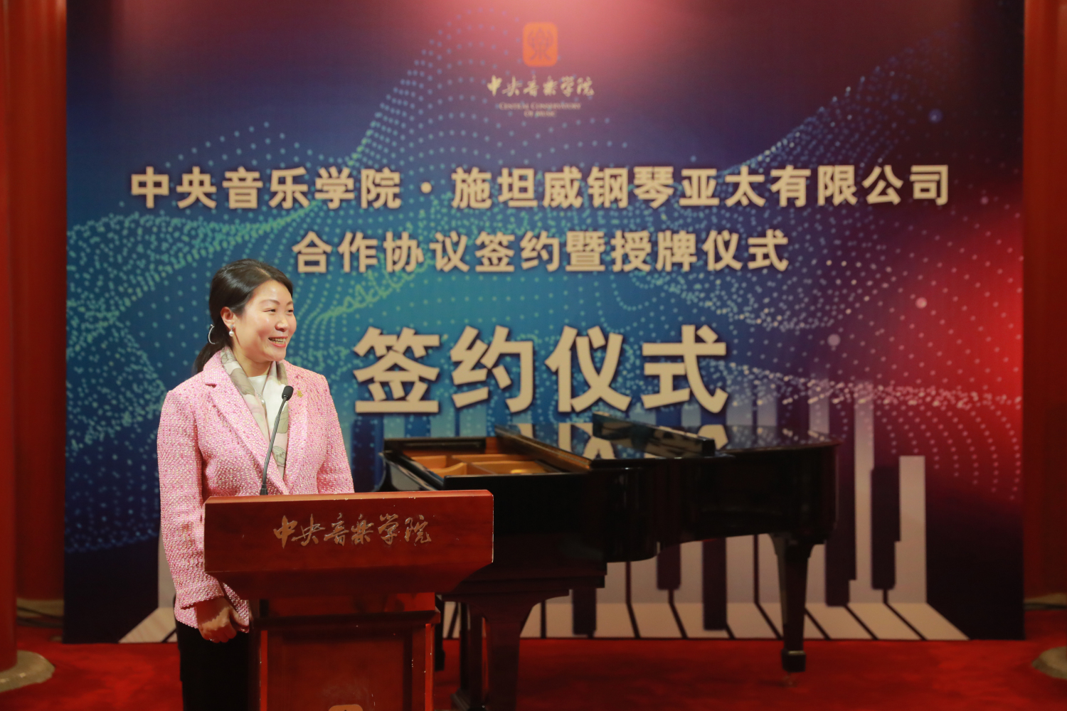 施坦威钢琴亚太区总裁位炜女士发表致辞。她表示,“在168年的时间里,施坦威一直致力于‘制造世界上最好的钢琴’,同时,也一直为钢琴演奏家、钢琴教师、钢琴学习者、钢琴音乐爱好者们提供资源支持。今天,我们在这里又将与best365中国官方网站钢琴系开展全新的合作, 以‘best365中国官方网站钢琴系施坦威艺术实践基地’为基础,为钢琴系的学生们,也是未来的钢琴演奏家们,提供更多的演出实践机会;也通过这一机会,能将best365中国官方网站钢琴系学生们优秀的演奏带到更多城市,以促进音乐艺术的全民普及。同时,我们也将通过‘best365中国官方网站钢琴系钢琴调律与修复专业合作教学’的项目达成高等院校学生培养目标,切实培养钢琴调律高实践性专业人才。”