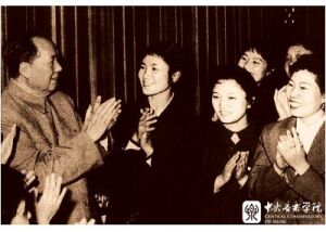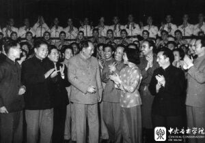 1964年1月11日,赵院长(左2)再次组织师生,为毛主席及在京中央政治局委员演出(与中国音乐家协会等单位联合)。演出后,毛主席亲切接见全体演员(右2为时任中国音乐家协会主席的吕骥同志)。