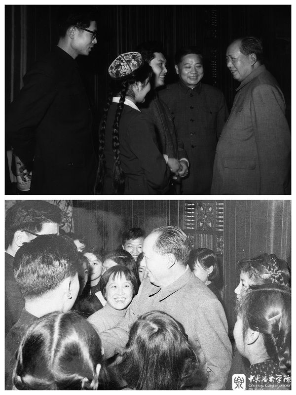 我当时在学校担任合唱队的指挥,合唱队以声乐系学生为主,其他系的学生也可以作为选修课参加。那场除夕音乐会来挑节目时,我们的合唱也被选上了。这个演出带有晚会性质,节目中间有休息、也有跳舞。在中间休息的时候,毛主席叫我坐在他的沙发旁边,非常和蔼地问我:“你叫什么呀?家在哪里?”还说:“你们的合唱唱得好,你指得也好。”我印象最深的是毛主席给我举了齐白石和徐悲鸿的例子。他说,齐白石就是学了中国的,徐悲鸿(学了中国的)也学了外国的,你们的音乐也一样,中国的、外国的都要学好,这样才能有新的、自己的(音乐)。这次演出对我们音乐学院来说是一件很重要、很有影响的事情。