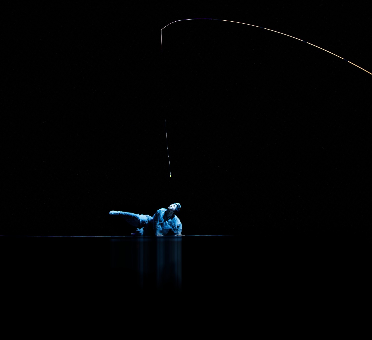 第十首作品现代舞《钓》,李文宇编舞,孟桓锋作曲。《钓》从钓鱼这一日常生活行为出发,以鱼的视角重新看待人与鱼的生存关系,通过鱼吃鱼饵、鱼上钩、鱼挣脱等情节,设计鱼的形象性动作予以表现。作品结尾巧妙设定鱼钓人的反转情节,传达出编导对自然生态环保意识的呼吁,同时以鱼象征人类,试图反映当下人与人之间的“钓”与“被钓”,引发观众的联想与思考。整体舞台与灯光设计朦胧梦幻,带给观众极佳的视觉体验。音乐的设计恰到好处,作曲者使用传统的单三部结构,由钓鱼到上钩,再到反转鱼钓人的“再现”。第一段的音高组织由一个和弦构成,通过音色、织体的变化体现鱼从一开始的好奇,到吃鱼饵时的欢喜,再到意识到危险,由弦乐拨弦音色描写水,再由管乐轻盈的肢体描写鱼。混合室内乐的编制轻盈不厚重,拉出足够的空间感。