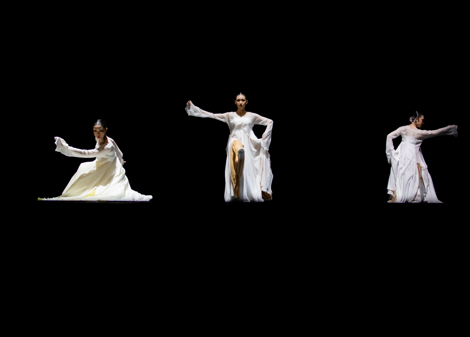 第十五首作品民族三人舞《Between the shadow》,孟婷婷、谭舒雨、林洁天编舞,李姿璇作曲;《Between the shadow》译为《对影》:“当月光洒在身上,我看到了影子,但那不是我。”这首作品以朝鲜族风格的音乐作为基础,整体音乐轻盈灵动,赋有变化。作曲者在西洋编制的室内乐团中加入了中国民族乐器古筝与室内乐团对立,正如“她”与两个“影子”的关系。古筝部分运用了大量的滑音与二度揉弦技巧,生动形象的刻画出她们之间的分离与融合,体现出了三者之间的对立和统一。
