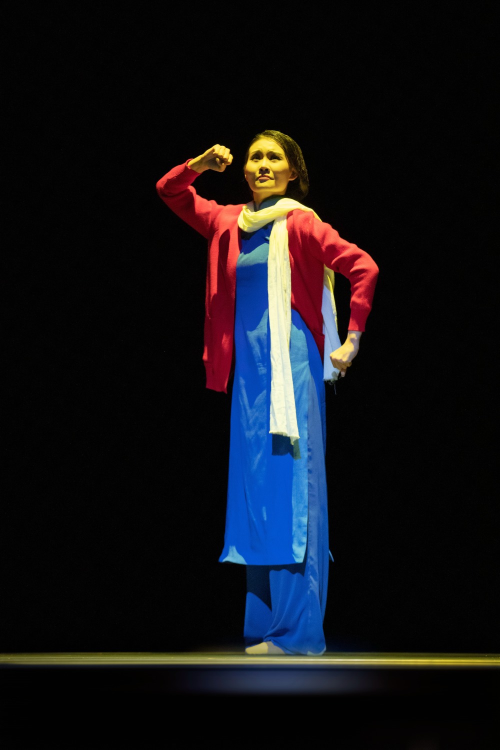 第三首作品现代舞《江姐》,谷敬一编舞,李尧作曲。作品创作时恰逢我党建党100周年,在这样伟大而又光荣的时刻,编创团队以江姐的故事为背景来回顾那段红岩往事。“敌人可以使我们的皮肉烧焦,筋骨折断,但却撬不开革命战士紧咬的嘴唇!”江姐用一生来诠释“英雄”二字如何书写。在音乐的设计中,作曲者将鲜明的主题动机在各调中不断延展,旋律气质与江姐的人物形象十分吻合,音乐与舞蹈共同致敬了伟大的革命先烈。