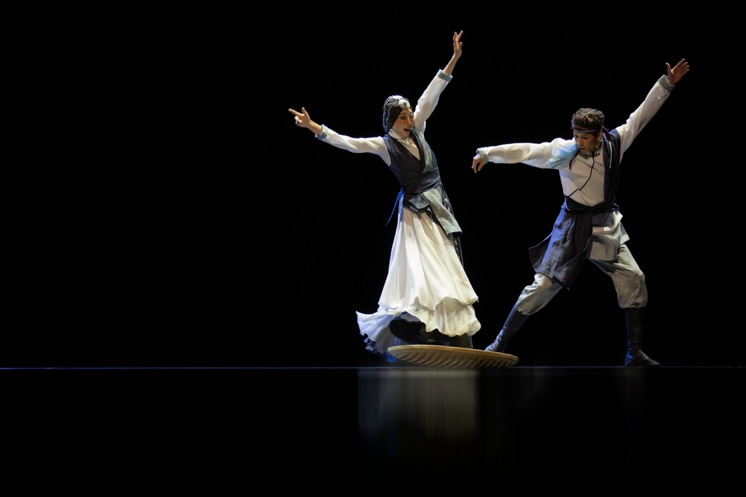 第八首作品民族舞《他乡》,曾雪琦编舞,马小喆作曲。本作品试图探讨社会结构改造下“奔赴异乡”的不可抗性与边缘群体的选择权话题,窥探光明面背后那暗潮汹涌的另一种可能。人在他乡,或是对美好未来的主动追求,也可能是无奈的流放;或是满心期待和憧憬,也可能是深感恐惧彷徨。“我所依恋的额尔古纳河是一轮月亮,悉数抚摸我的伤痛;我所神往的额尔古纳河是一轮太阳,由神托举着照亮我回家的路。”音乐设计中,呼麦的开场与极其带感的中国大鼓可谓是作品中的亮点,浓厚而深沉,将观众引入音与舞的奇妙盛宴,感受蒙古族大气且深沉的情怀…