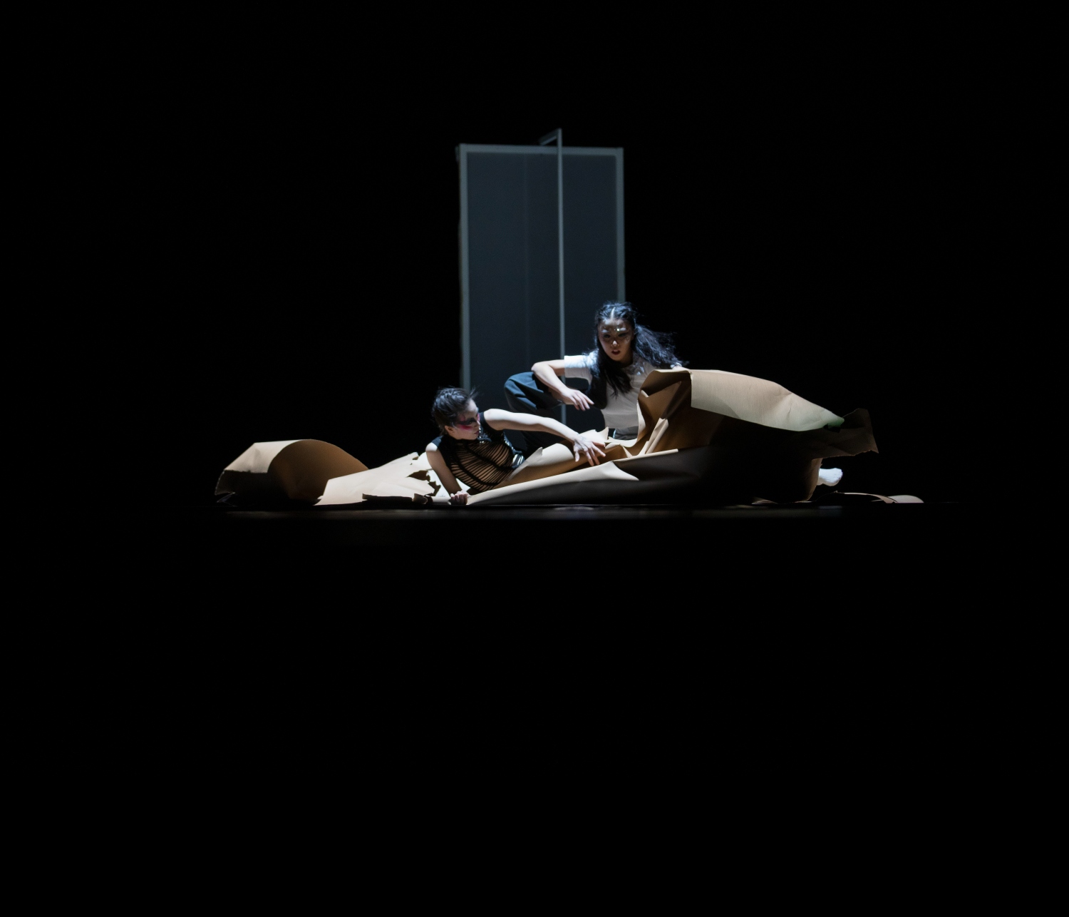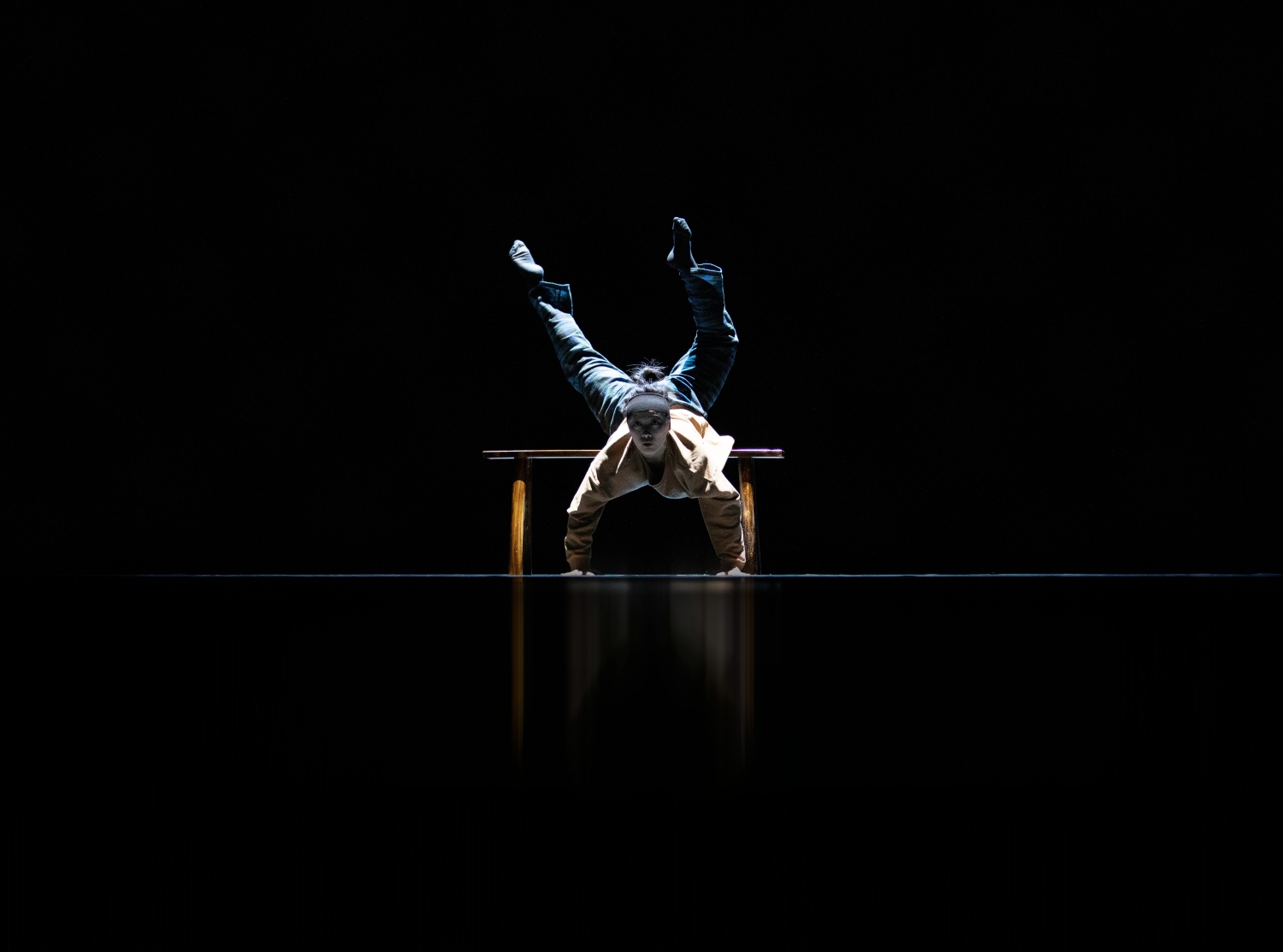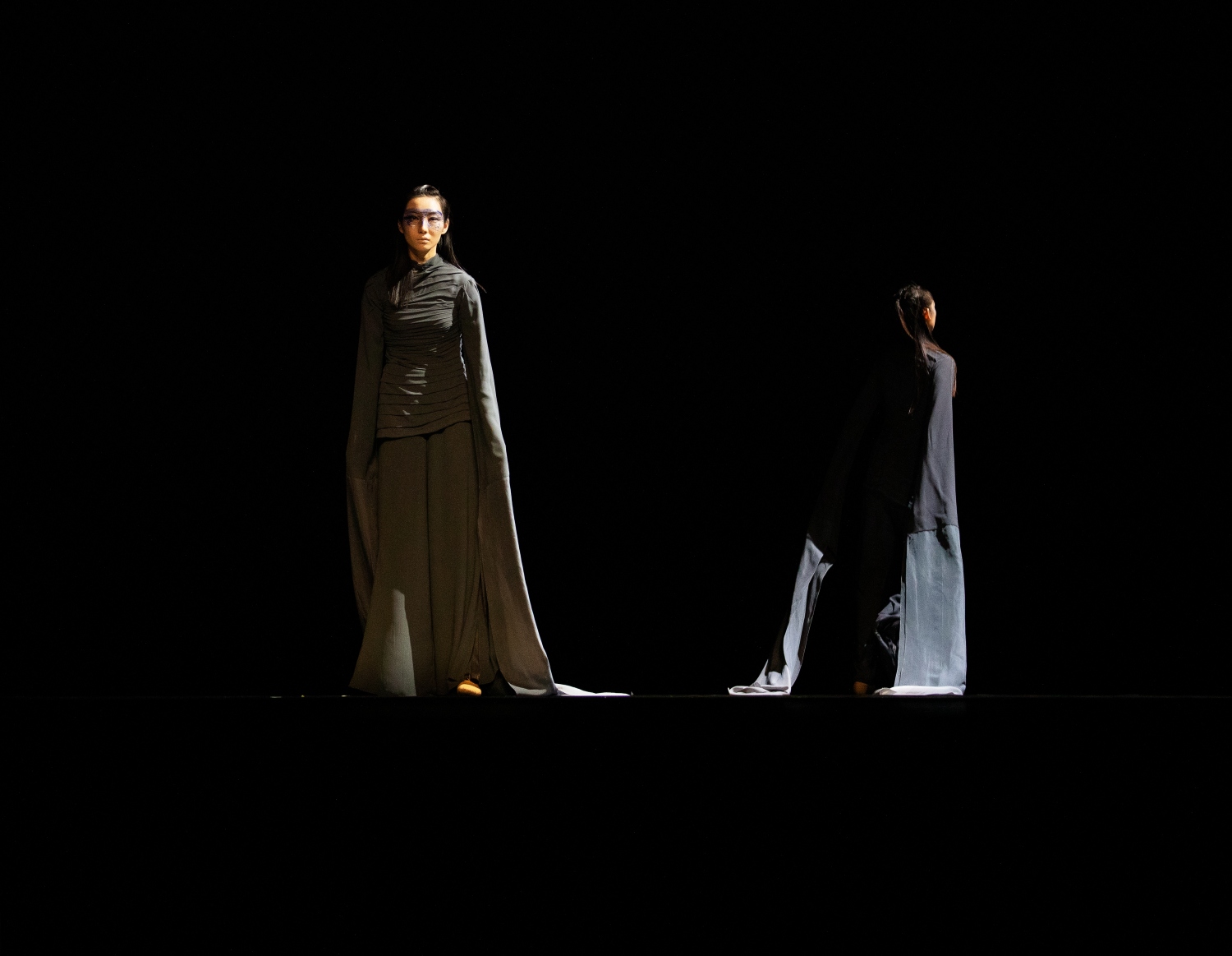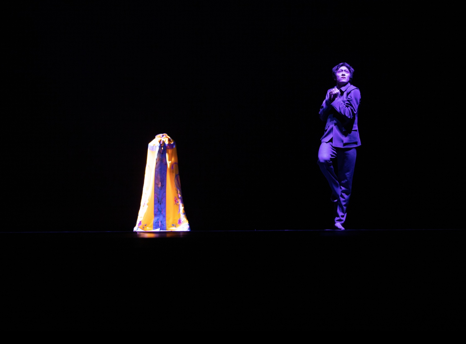 第七首作品现代双人袖舞《椅·倚》,曹力丹编舞,丁木作曲。作品中巧妙运用了钢琴与打击乐,简单的编制表现出的是不简单的设计,两位舞蹈演员借助一只长凳,表现了椅与倚之间,时空与人、心间的对话。独特的动作设计与妆造,让观众近距离体验了现代舞虚实结合的无限魅力。