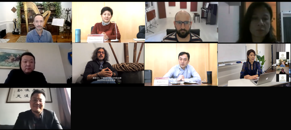根据时差,中外作曲家们分为两组,通过线上会议的形式齐聚一堂,通过对话的方式相互沟通交流,用英文介绍自己的作品,交流创作心得,分享了对中国民族音乐和乐器的了解和创作理念。会议由作曲系周娟教授和史付红副教授主持,从专业的角度对每部作品给出了建议,并鼓励大家在今后的创作中运用好自身特质的音乐语汇,通过作品展现出民族多样性和特色。