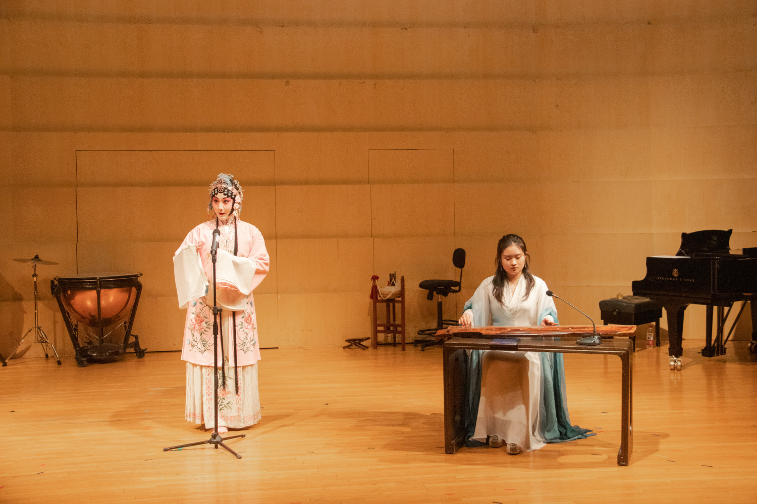 第二首曲目《打虎上山》由徐翌婷演奏三弦、刘弘婕演奏扬琴,《智取威虎山》本是现代京剧,在本场音乐会选用京剧乐队四大件中的弹拨乐器之一——三弦配合扬琴演奏,别有一番韵味。