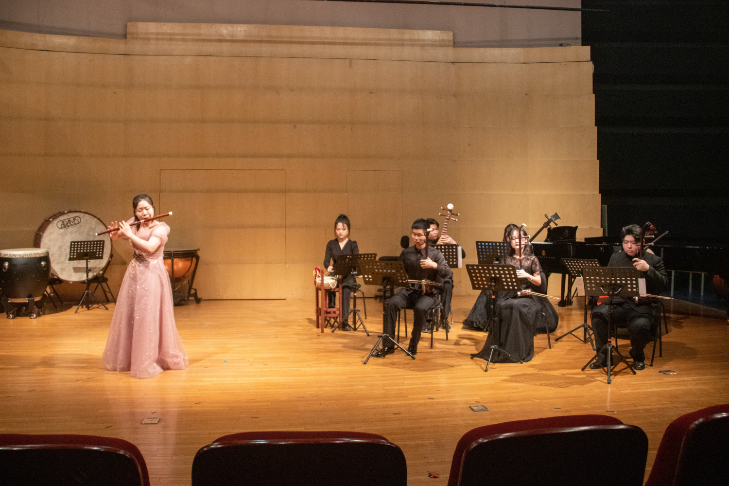 第三首曲目《三五七》是赵松庭 1957 年根据浙江婺剧乱弹唱腔改编而成的同名笛子独奏曲,曲名出自曲牌《忆江南》的词格。竹笛由大一的裴云秀同学独奏,与刘虹佑、韩淇凇、林柏村、李沐樨、李思佳、居涵榕、段智怡七位同学共同演奏。