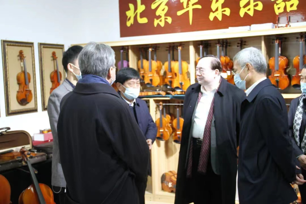 揭牌仪式后,与会领导前往华东乐器有限公司考察参观。现场调研观看了音乐美育课堂的关于提琴制作的教学短片,走访乐器展览、提琴制作工作坊等多个音乐主题教育展厅。
