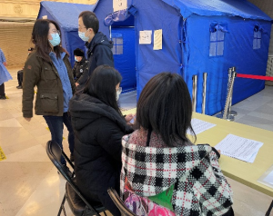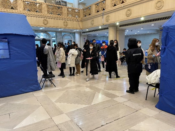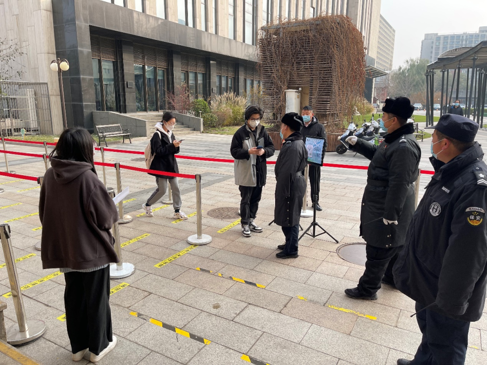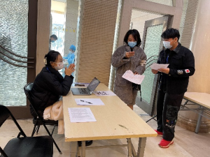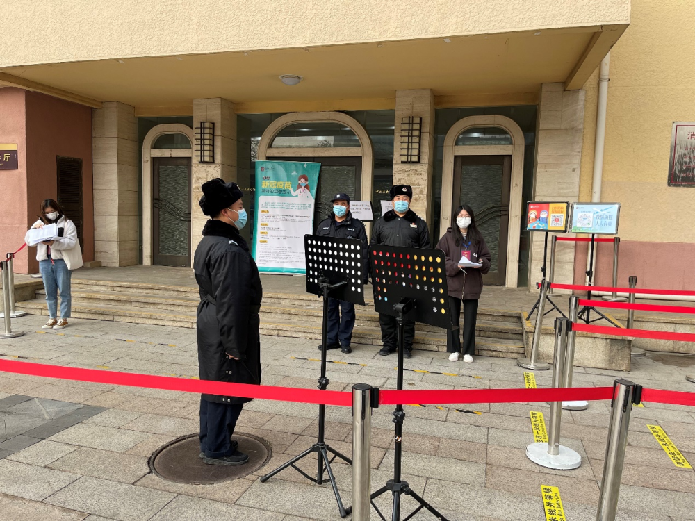 保卫部安排人员,接种点门前,查验健康宝、大行程、测温后,进入接种区。