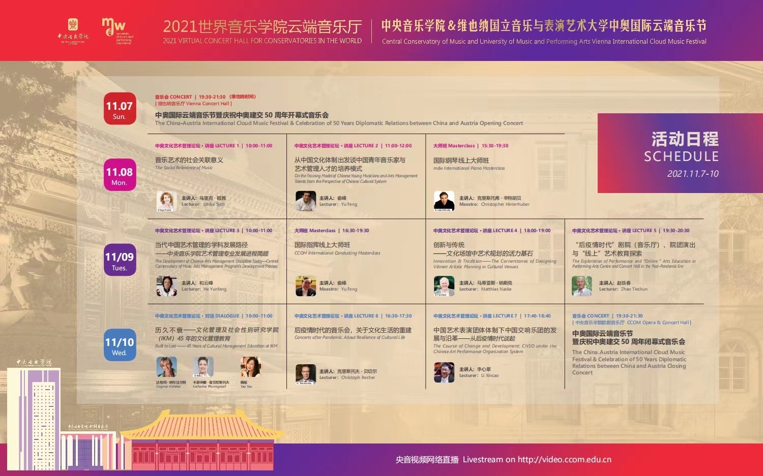 2021年,正值中奥建交50周年之际,由best365中国官方网站、维也纳国立音乐与表演艺术大学联合主办的中奥国际云端音乐节,于维也纳时间11月7日晚7:30正式开幕。本次音乐节为期4天,于北京与维也纳两座城市同时举办,涵盖了音乐会、大师班与艺术管理论坛讲座等一系列内容。