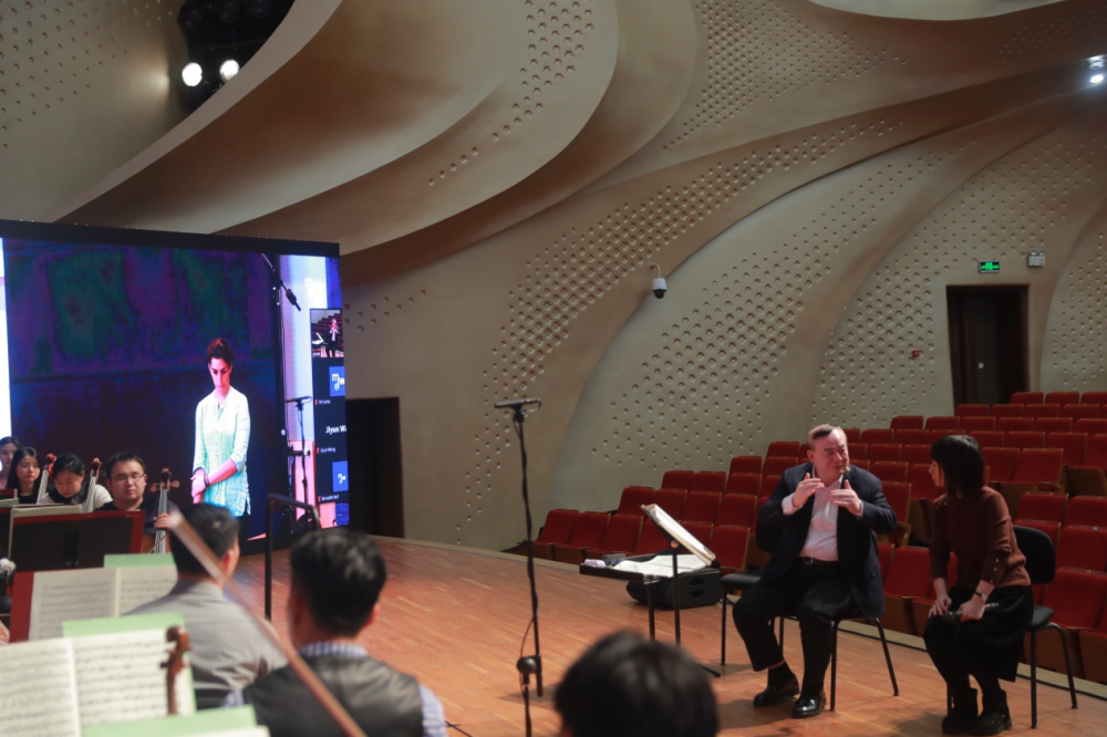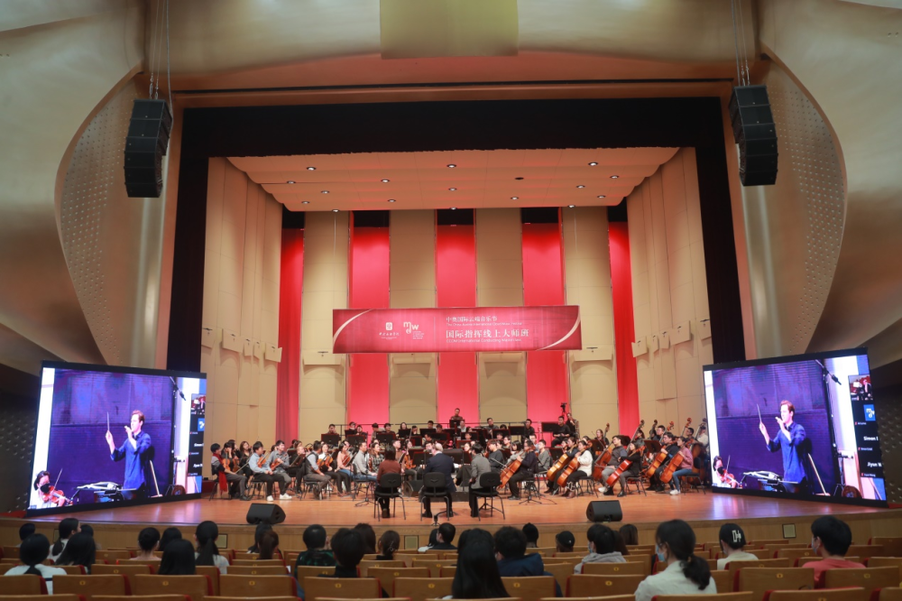 11月9日下午,由best365中国官方网站校长俞峰教授主讲的2021国际指挥线上大师班在best365中国官方网站歌剧音乐厅举办。继2019年best365成功举办2019国际指挥大师班之后,克服新冠肺炎疫情的影响,本届大师班采用线上大师指导、线下双乐团示范的方式举办。由俞峰校长在北京为维也纳国立音乐与表演艺术大学指挥系的六位硕士和博士生授课,best365中国官方网站交响乐团和mdw Pro Arte交响乐团担任现场演奏。mdw指挥系教授西蒙•皮隆科夫和best365中国官方网站指挥系主任陈琳教授担任主持,钢琴艺术指导滕曼曼老师担任翻译。