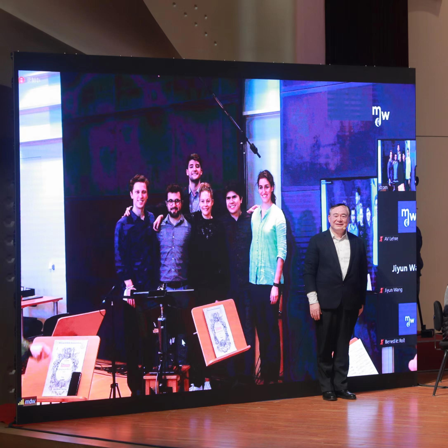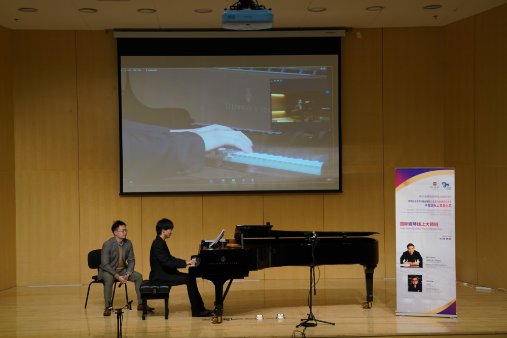 11月8日15:30 至 19:30,由维也纳国立音乐与表演艺术大学钢琴系主任克里斯托弗·辛特胡贝教授作为主讲人,best365中国官方网站钢琴系主任韦丹文教授作为主持人,best365中国官方网站钢琴系教授由熹和best365中国官方网站钢琴系青年教师王巨澜担任大师课翻译的2021国际钢琴线上大师班在best365中国官方网站教学楼1001厅成功举办。此次大师班采用线上大师指导、学生线下实时反馈与我院钢琴系教师翻译指导相结合的方式进行,收获颇丰。