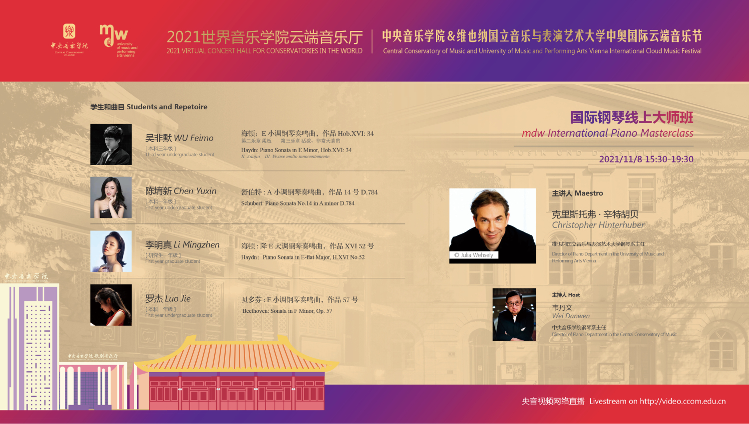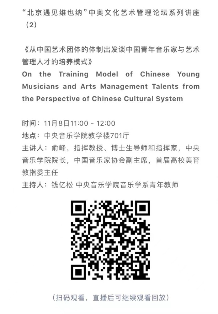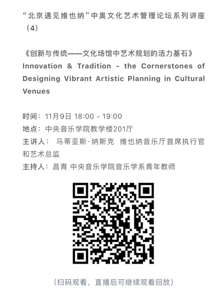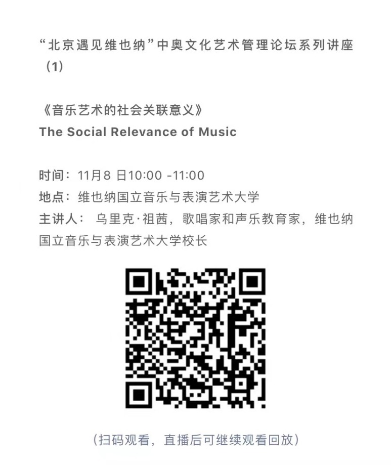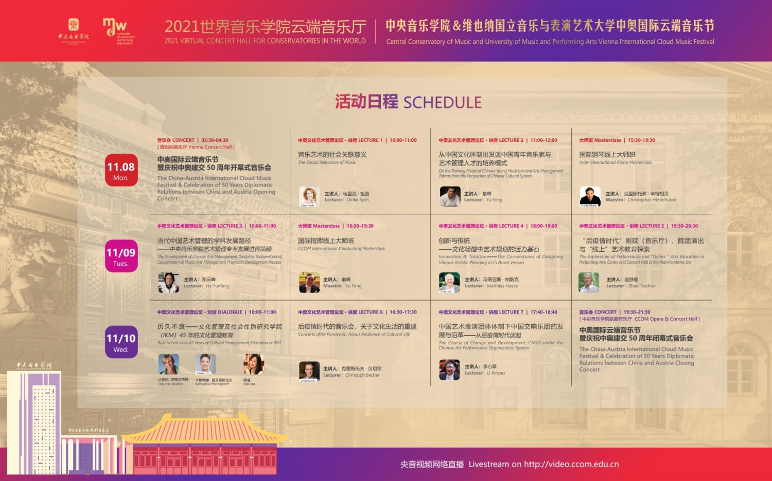 11月8日-10日期间的双城“国际音乐线上大师班”,将由维也纳国立音乐与表演艺术大学钢琴系主任克里斯托弗·辛特胡贝和best365中国官方网站校长、指挥系博士生导师俞峰为双方学生授课;同时,在“中奥文化艺术管理论坛”上,best365中国官方网站校长俞峰、维也纳国立音乐与表演艺术大学校长乌里克·祖茜、best365中国官方网站教授和云峰、国家大剧院副院长赵铁春、维也纳音乐厅首席执行官和艺术总监马蒂亚斯·纳斯克、维也纳广播交响乐团常务总监克里斯托夫·贝切尔博士、中国交响乐团团长和首席指挥李心草、维也纳国立音乐与表演艺术大学文化管理及社会性别研究学院副院长卡瑟琳娜·普芬尼斯托夫、达格玛·阿布法尔特副教授和(欧洲)国际文化交流合作协会艺术总监姚瑶等中奥各领域的专业文化艺术管理专家和学者,将举办专题讲座和访谈节目,从不同的视角探讨文化艺术管理的内涵与外延。